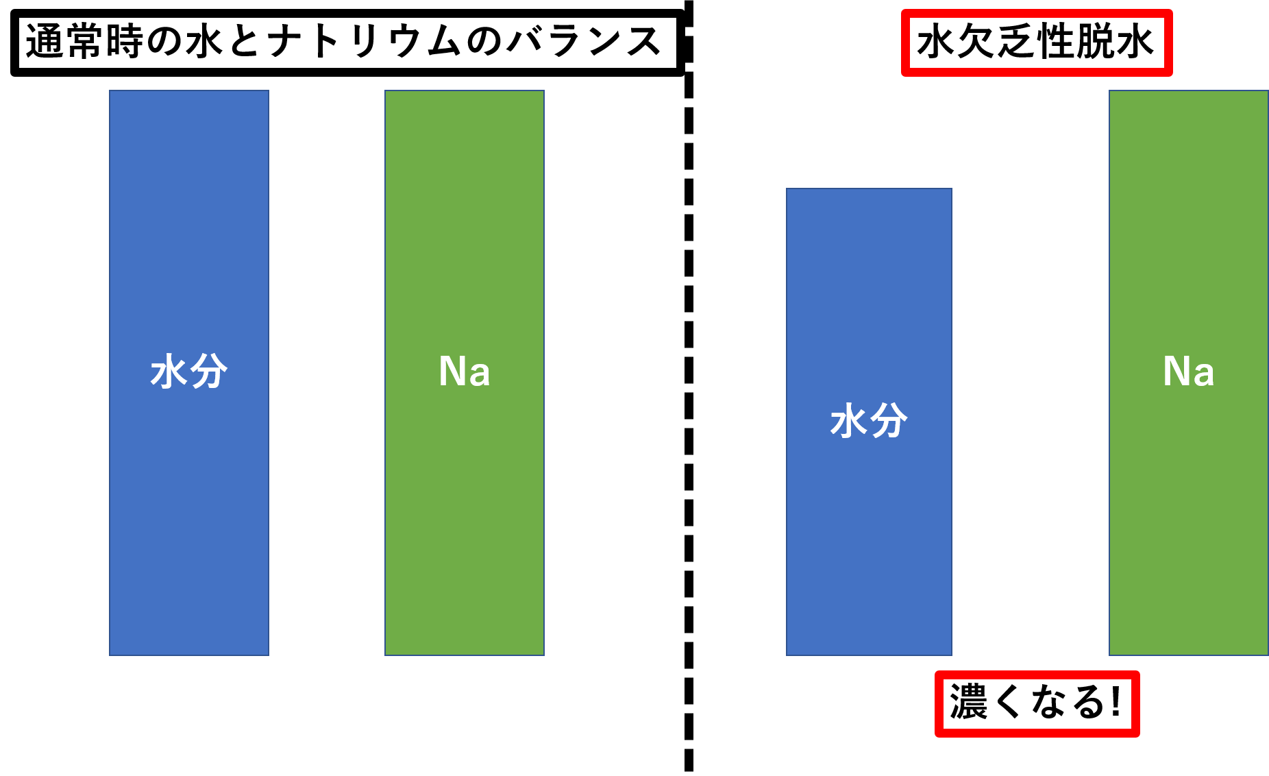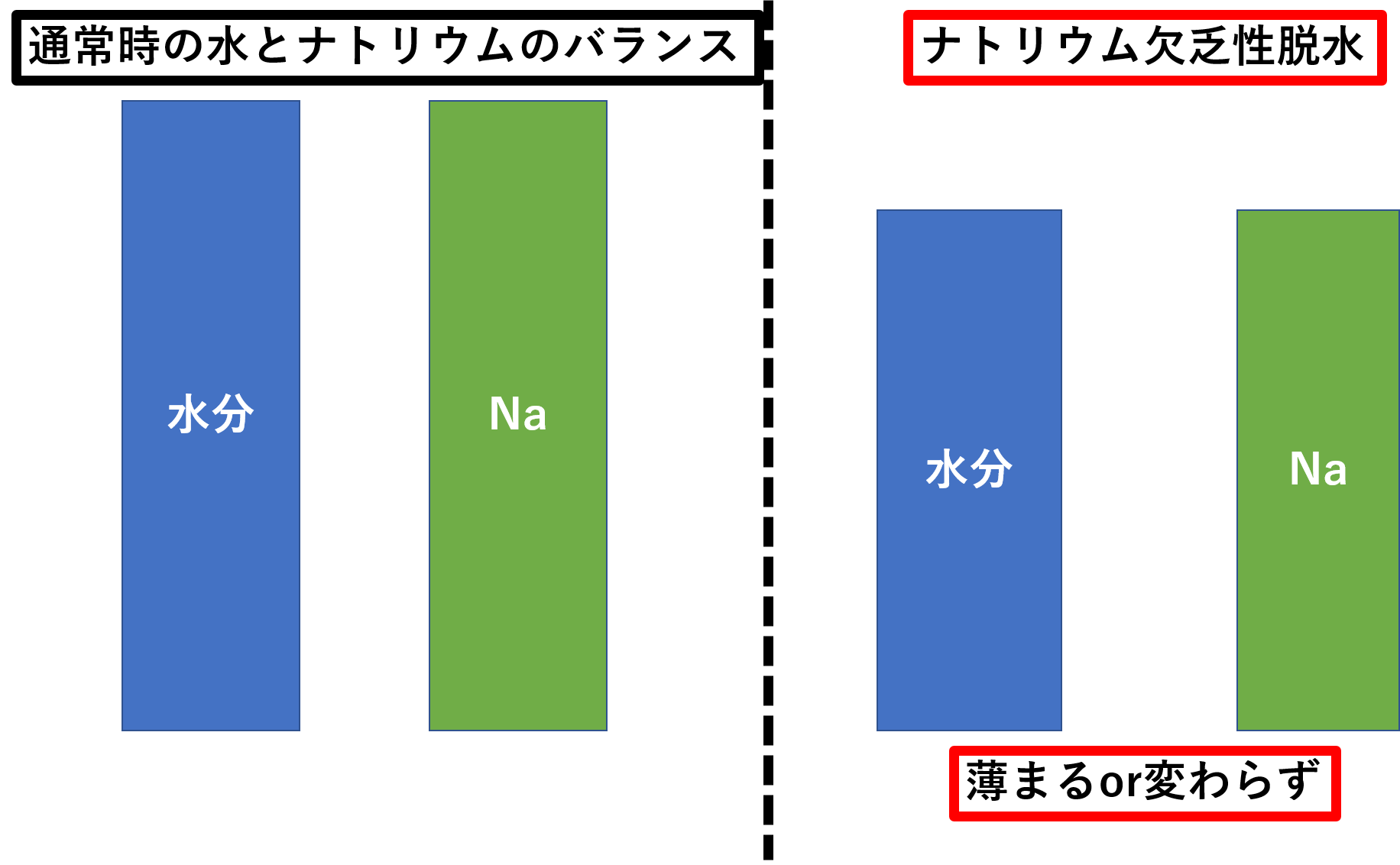 ナトリウムと水が失われている状態です。こちらは、塩水の塩と水が両方飛んで行ってしまっている(実際の塩水は塩は飛びませんが)ため、塩水の濃さは変わらない、あるいは薄くなるイメージです。