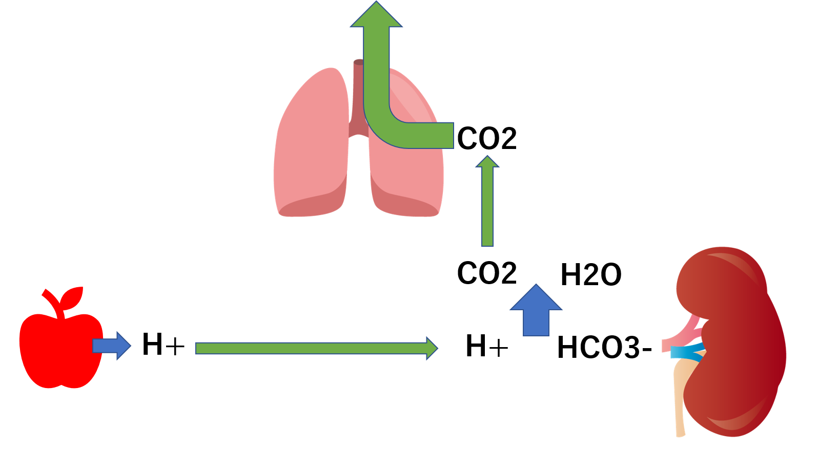 食事や代謝によって、酸(H+)が発生すると、血液にのって腎臓に到達します。腎臓ではH+を尿中排泄する作用があります。
