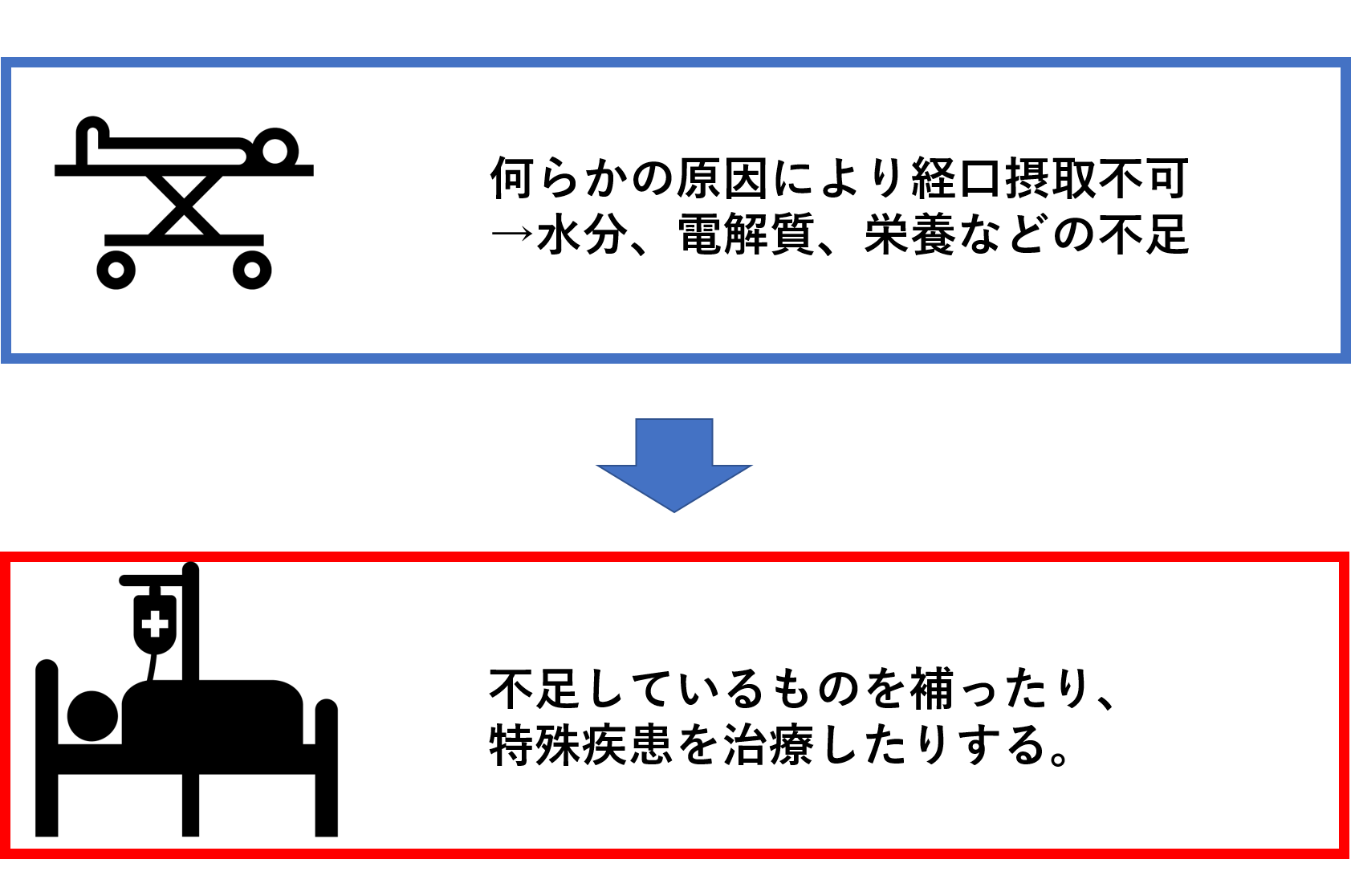 輸液は主に静脈から水、電解質、栄養などを投与することです。つまり、患者さんは何らかの原因で口などから、普段の生活通りに接種することができていない状態です。