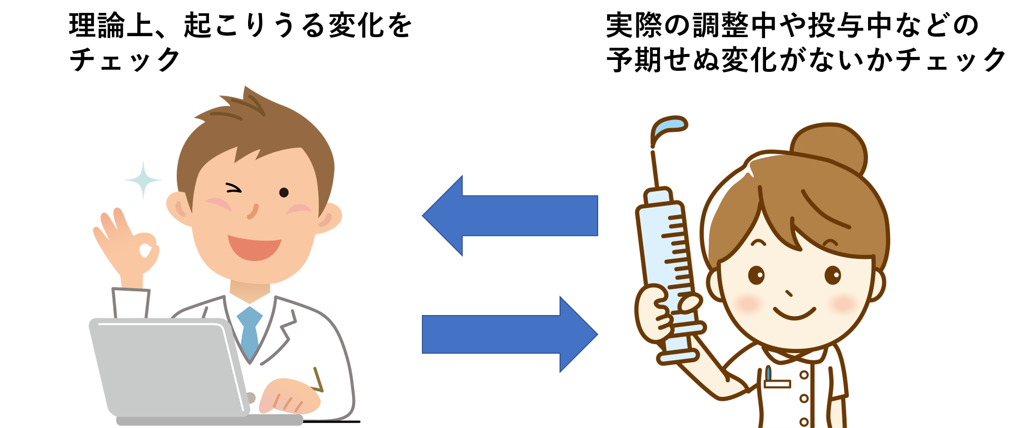 看護師さん側は調製や実際の投与中の問題を防ぐことが重要となります。