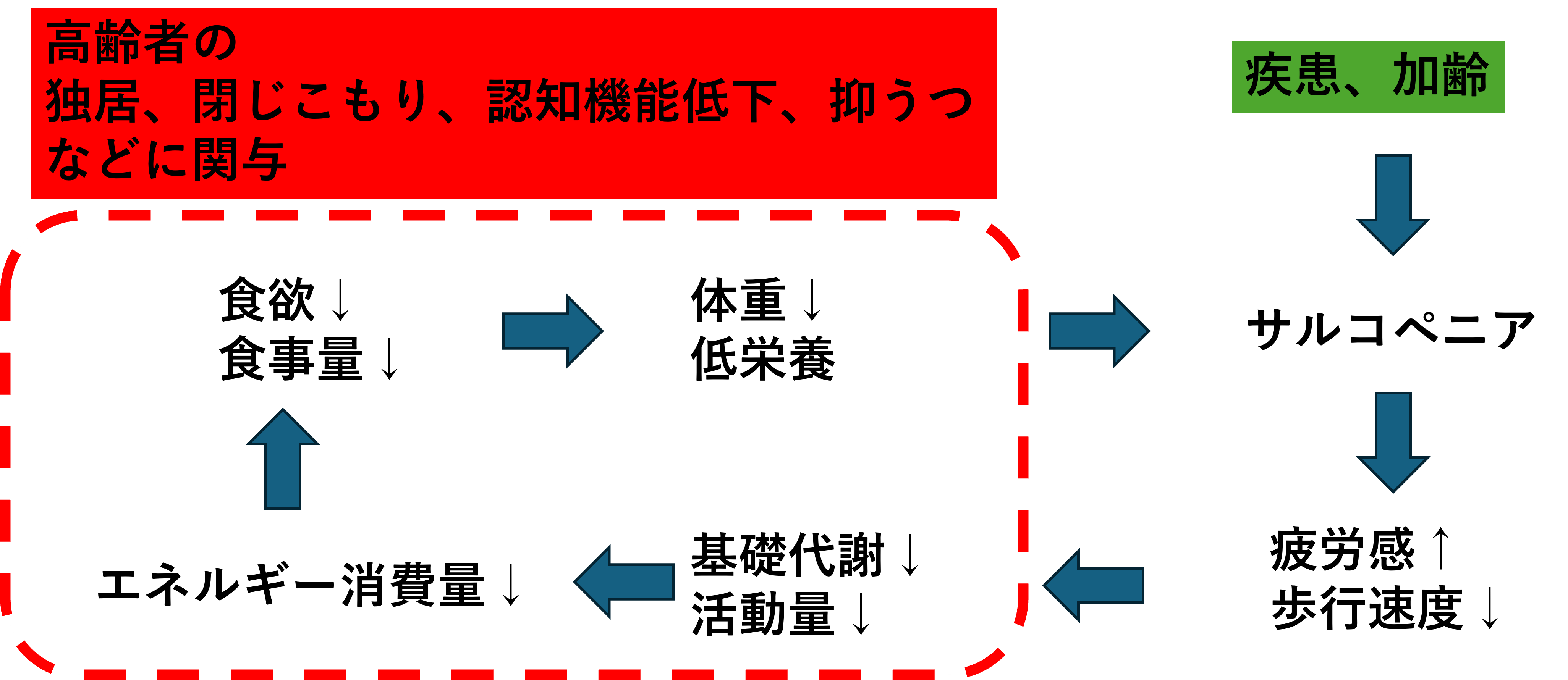 食欲の低下や食事量が低下すると、体重が落ち、サルコペニアが加速するという負のスパイラルとなります。