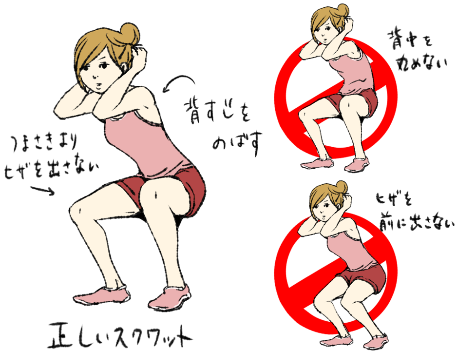 悪いスクワットの例としてしゃがみ込む途中でお尻が後ろに回って骨盤が後ろに傾いてしまうやり方です。その時に腰椎の前方への弯曲が減少し、椎幹板に加わる負荷が増えてしまいます。このため椎幹板への負担を減らすためには、体幹筋を利かせて骨盤を前に傾けて腰椎の前弯を保ちながらしゃがみ込んでいく動作が求められます。このような骨盤の前傾を保ったしゃがみ込み動作は、日常生活動作で腰痛を起こさせないためにも必要な動きです。