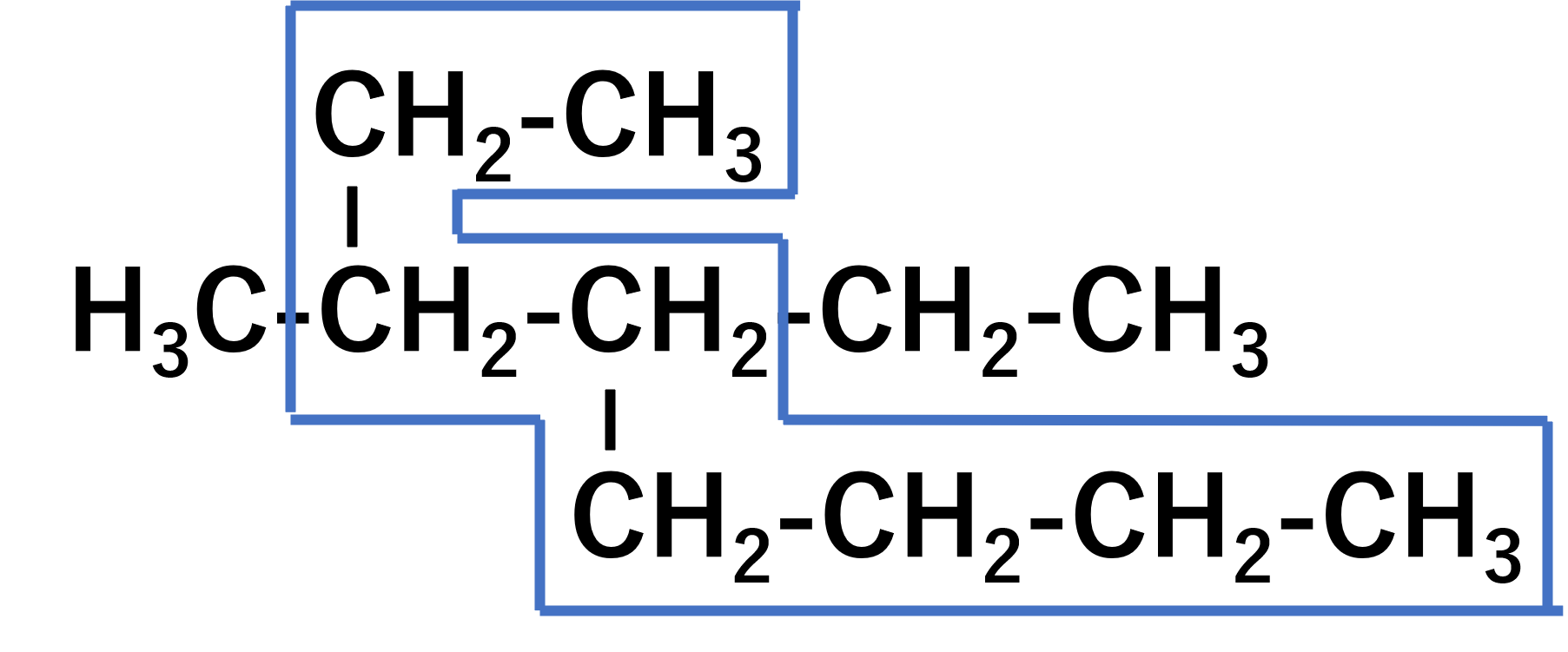 色々枝が生えていますが、やることは同じです。まず母体を探します。見ていくと最長の炭素は8個です。よって、これはオクタンと判断することができます。