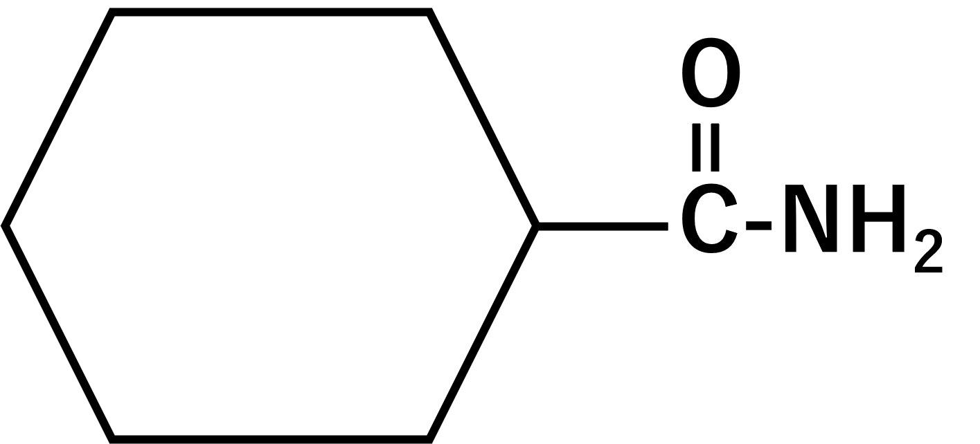 次にカルボン酸を探します。環状化合物を持つ場合のカルボン酸は、環の後にカルボン酸(carboxylic acid)をつけて命名でしたね。今回はシクロヘキサンにカルボン酸がついているため、シクロヘキサンカルボン酸がカルボン酸部分となります。これをカルボキサミド(carboxamide)に変えて命名するので、シクロヘキサンカルボキサミド。これが答えです。