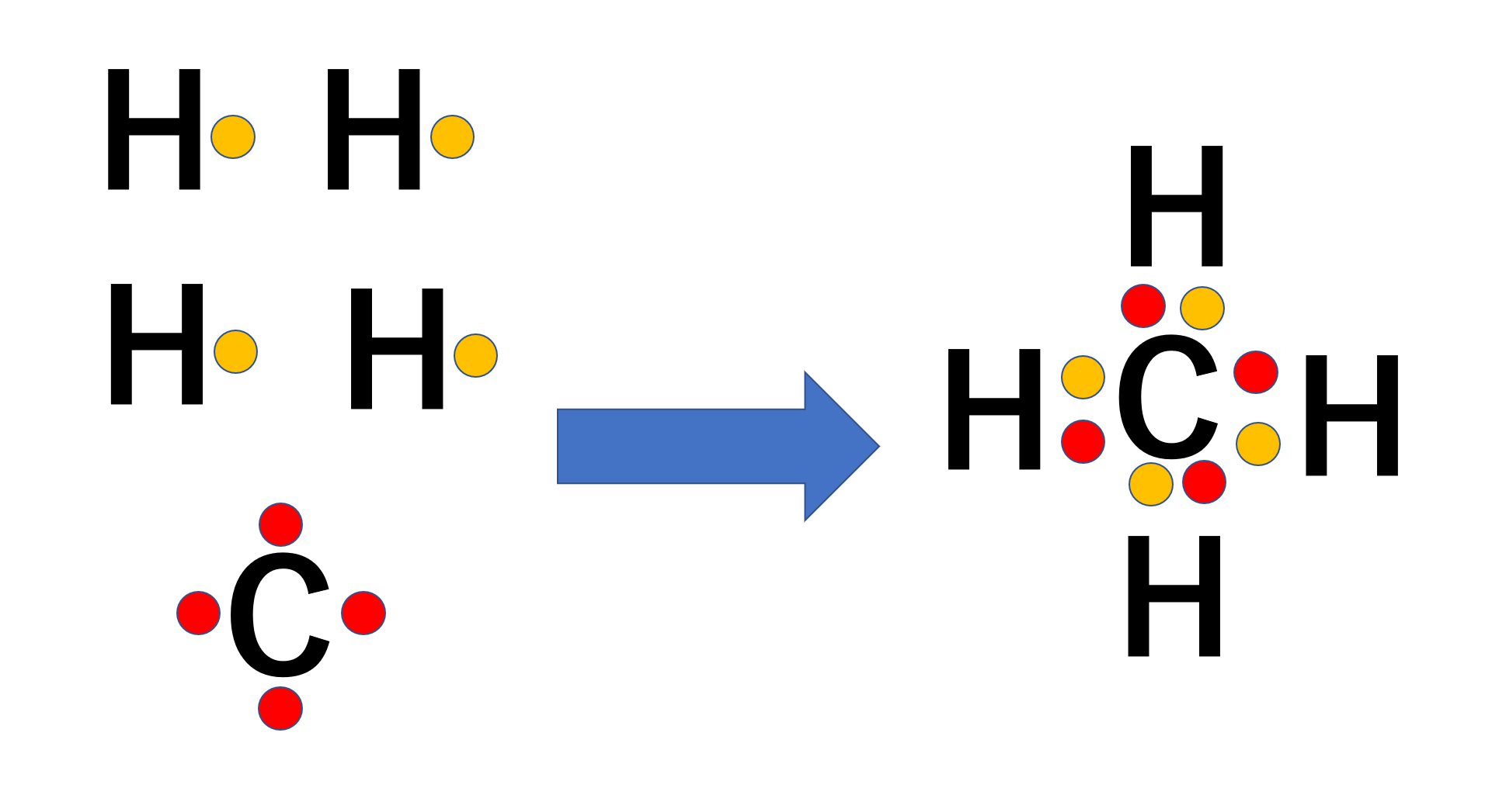 炭素は価電子が4個であり、水素は価電子1です。原子は最外殻電子が埋まると安定化するため、価電子1の水素が価電子4の炭素に結合することで安定します。