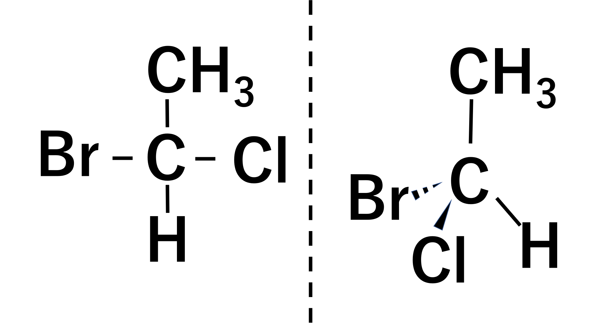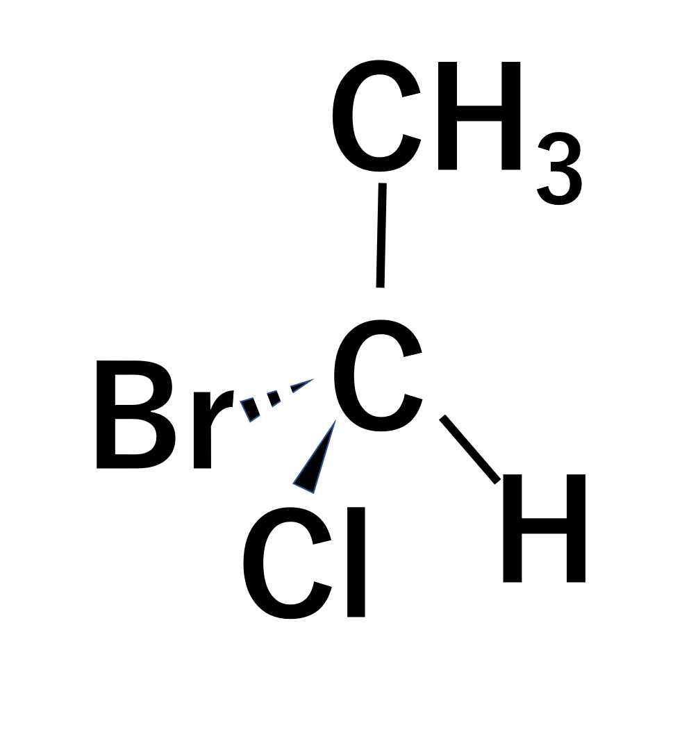 以前から当たり前のように使っていますが、太い三角形の単結合は紙のある平面より手前側に出ていることを示します。逆に点線の太い三角形の単結合は紙のある平面より奥側にあることを示します。Fischer投影式はこれを用いて立体的に構造式を表現する方法になります。