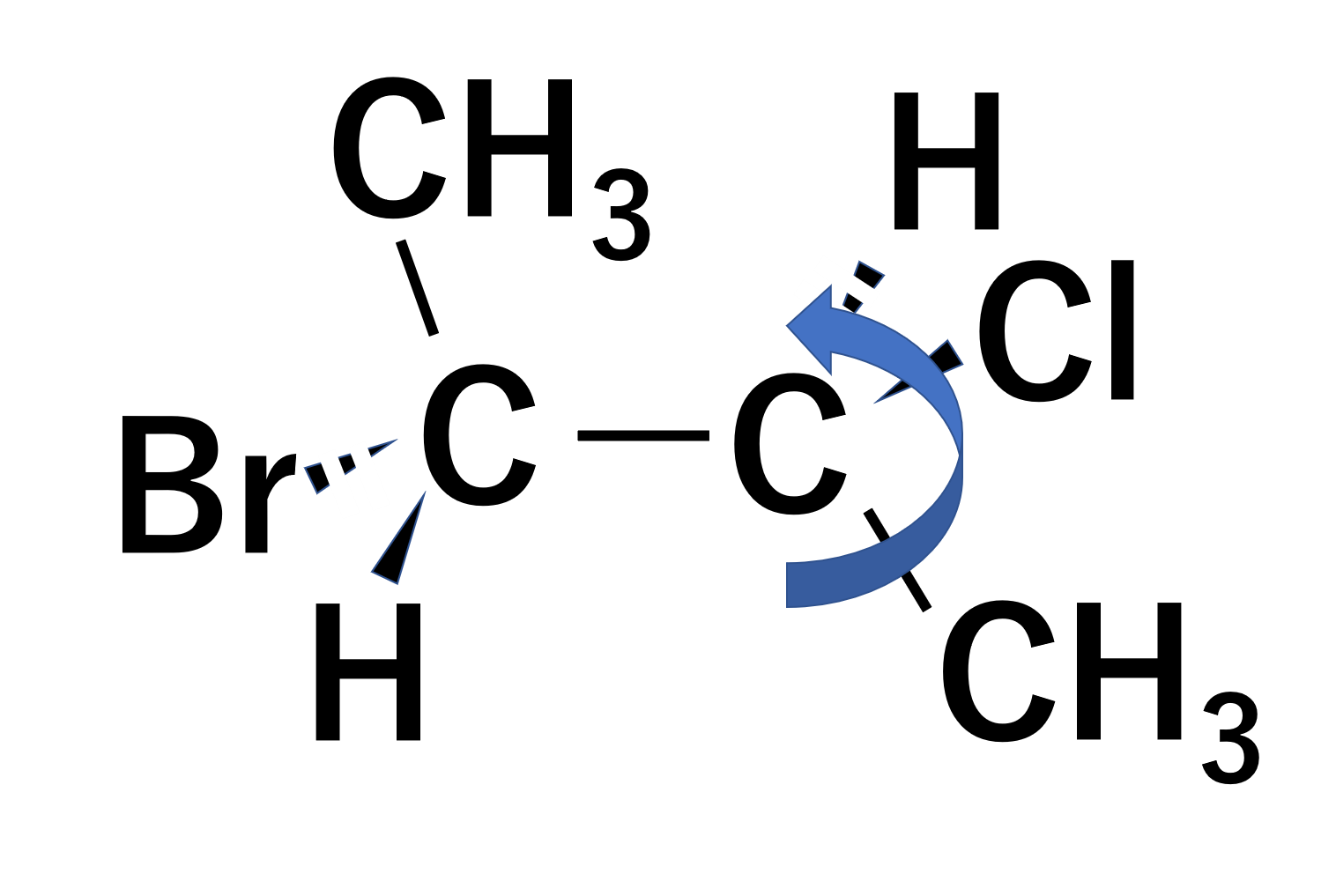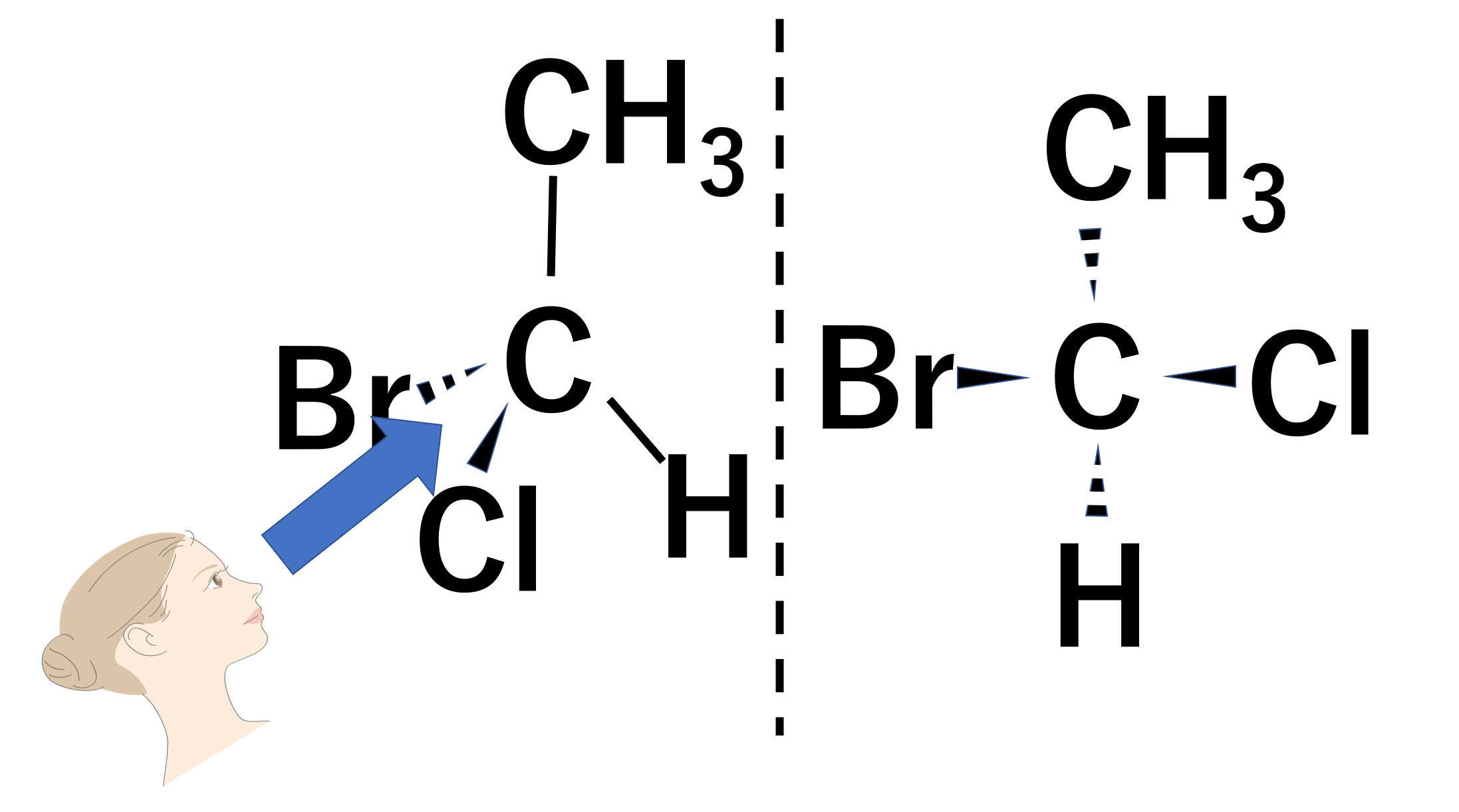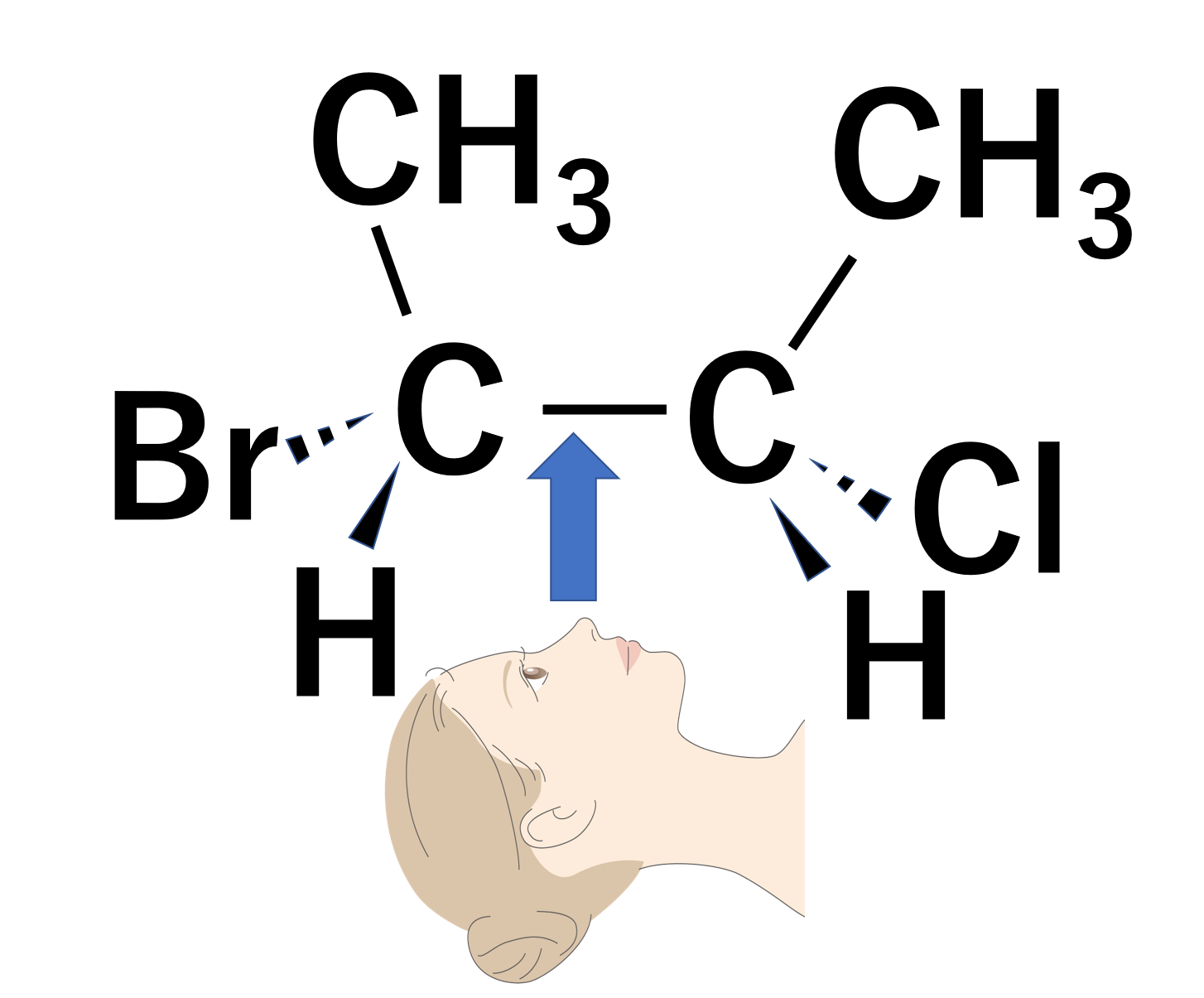 最初の構造式が先ほどとは違います。平面上にあるのは、CH3-C-C-CH3となります。平面より手前に出ているのは左側のHと右側のClです。平面より奥にあるのは、左側のBrと右側のHです。
