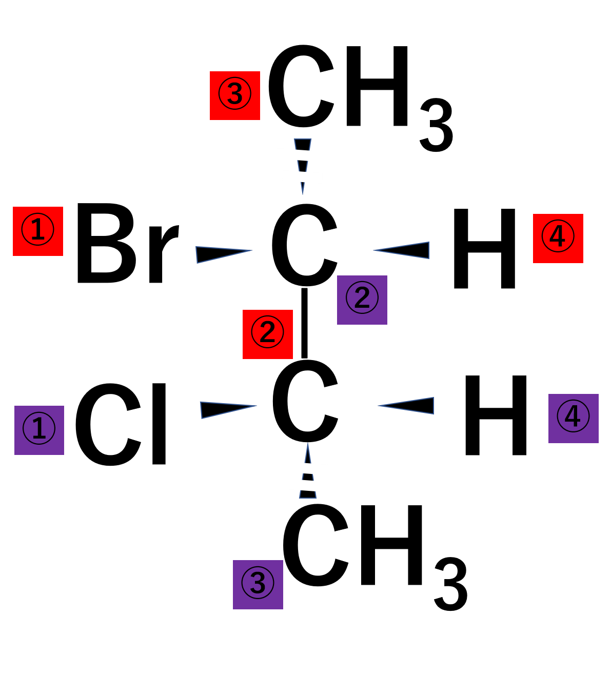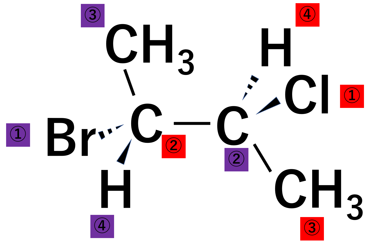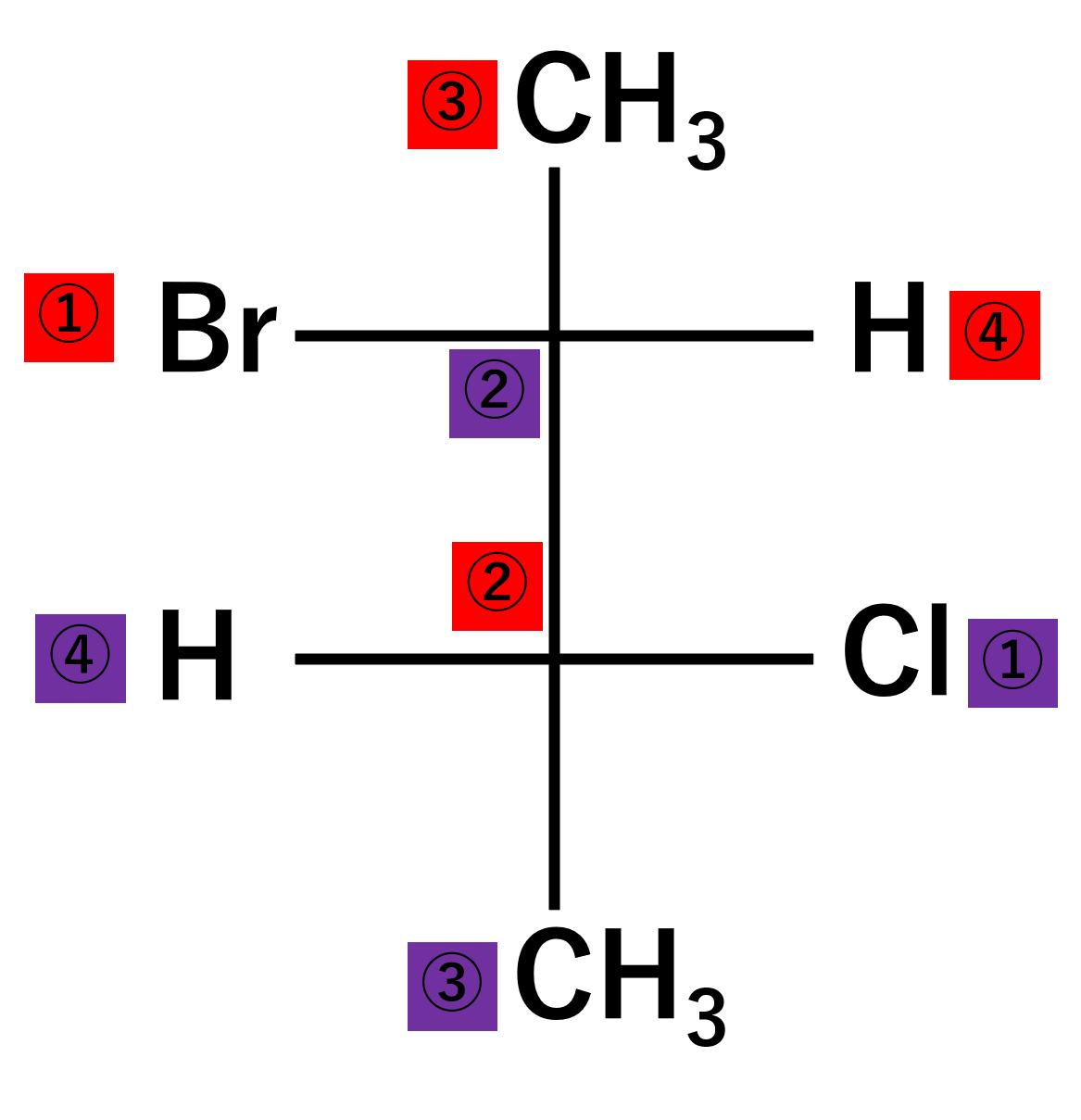 それぞれの優先順位をつけると以下のようになりますが、両方の炭素とも先ほどのようにC番目の水素が手前に向いているため注意が必要です。