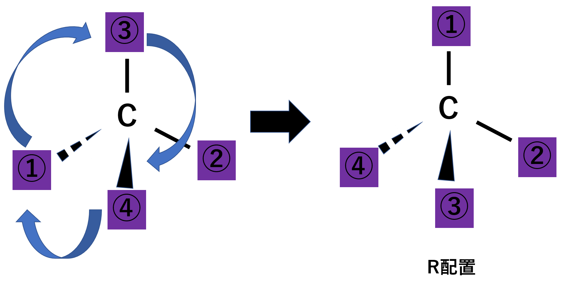 このような時に使われるのがRS表示です。前回のZ配置やE配置を決める時に使った優先順位のルールに則り、炭素原子についているその他の原子に優先順位をつけます。優先順位のC番目を奥に置いたときに、残りの@、A、Bが時計回りならR配置となります。逆に@、A、Bが反時計回りならS配置となります。