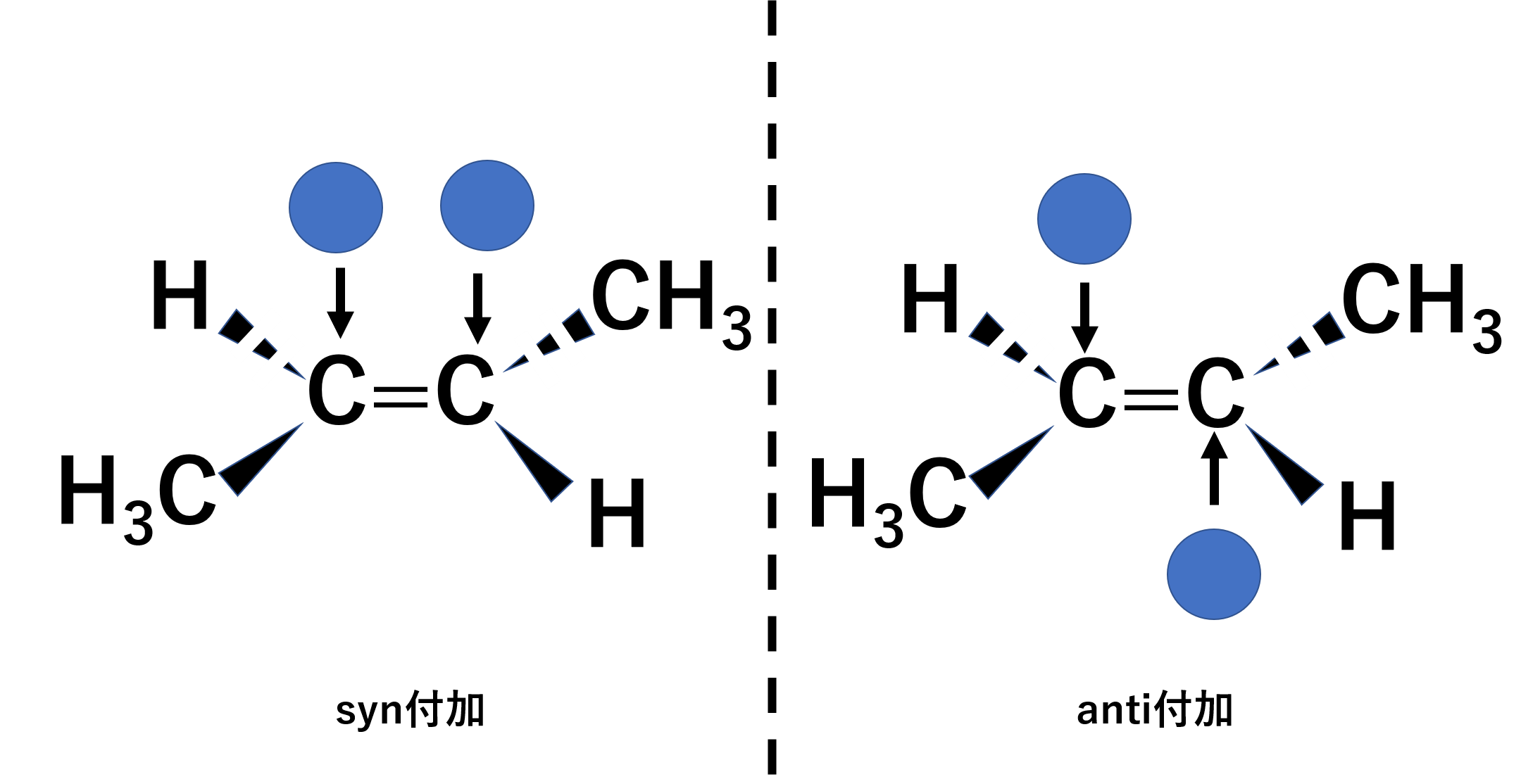 今回から反応機構を見ていきますが、たくさん種類があるので何回かにわけて書いていきます。今回はアルケンのsyn付加とanti付加を見ていきます。