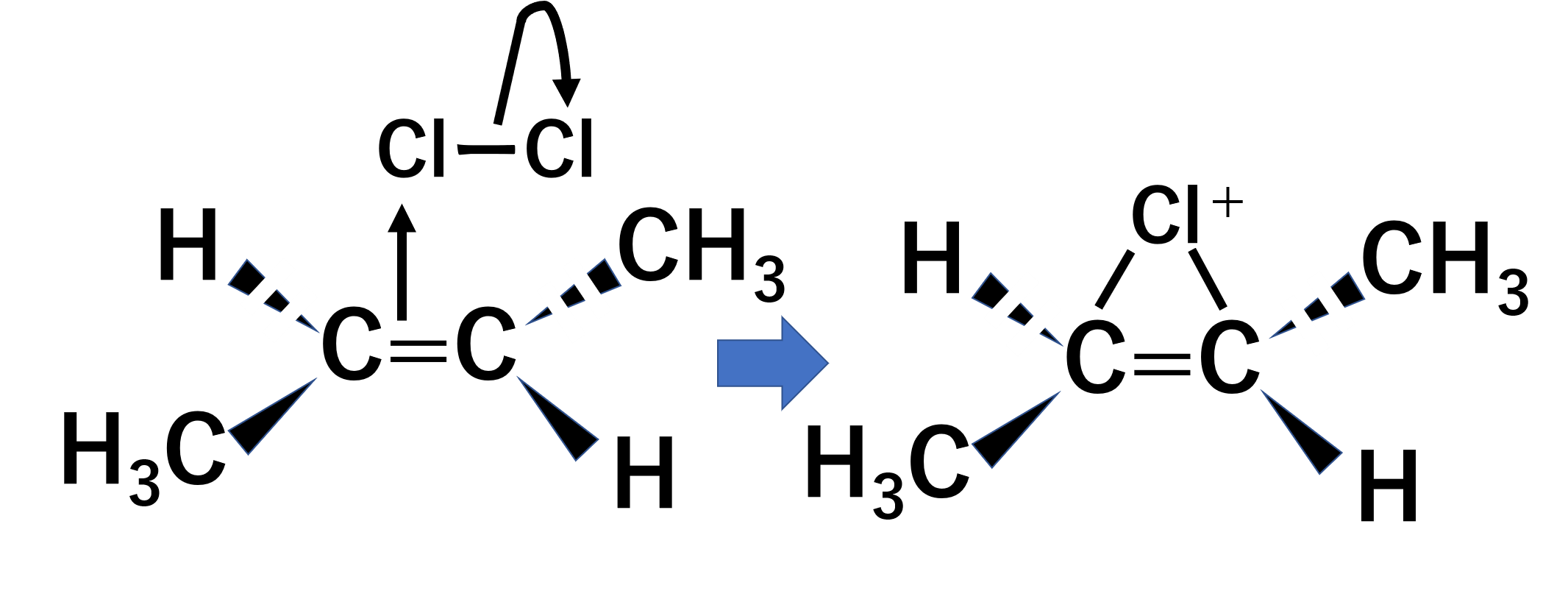 まずtrans-ブタ-2-エンのπ結合が、上側から塩素の片方に攻撃をし環状化合物を作ります。塩素は電気陰性度が高いため、電子を引き寄せようとします。そのため攻撃を受けた塩素は単結合を切り塩化物イオンが生じます。
