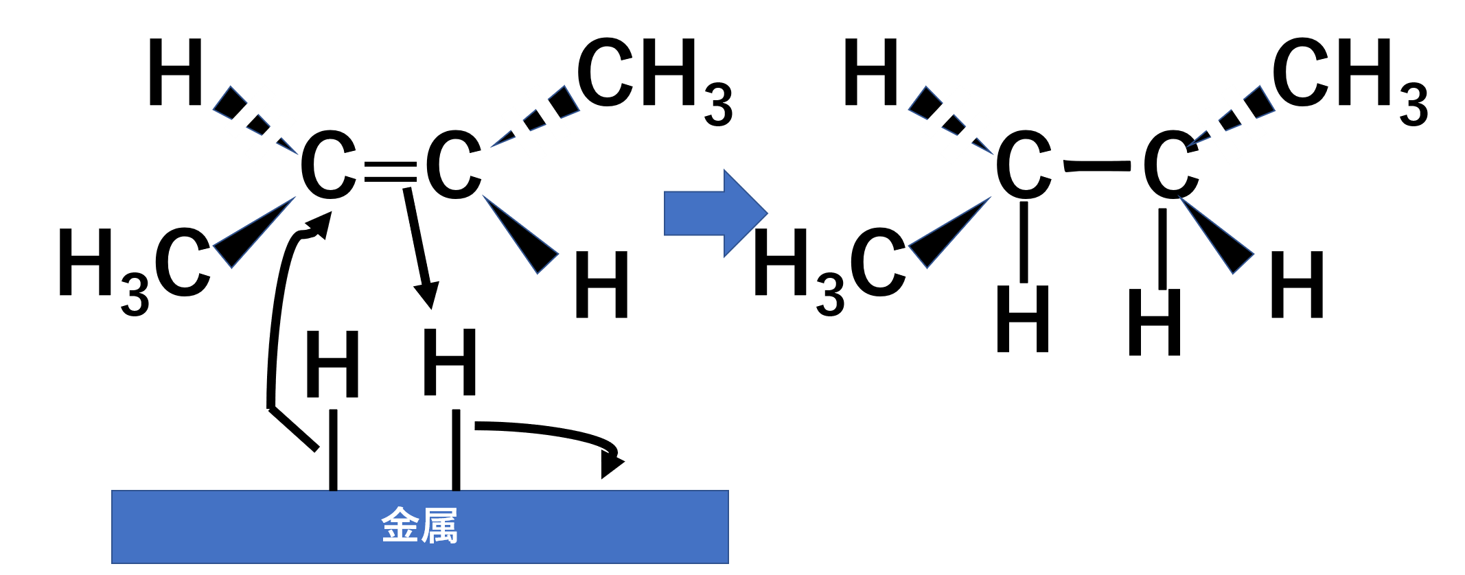 PdやPtなどの金属触媒がある状態で水素と反応させると、水素がsyn付加します。