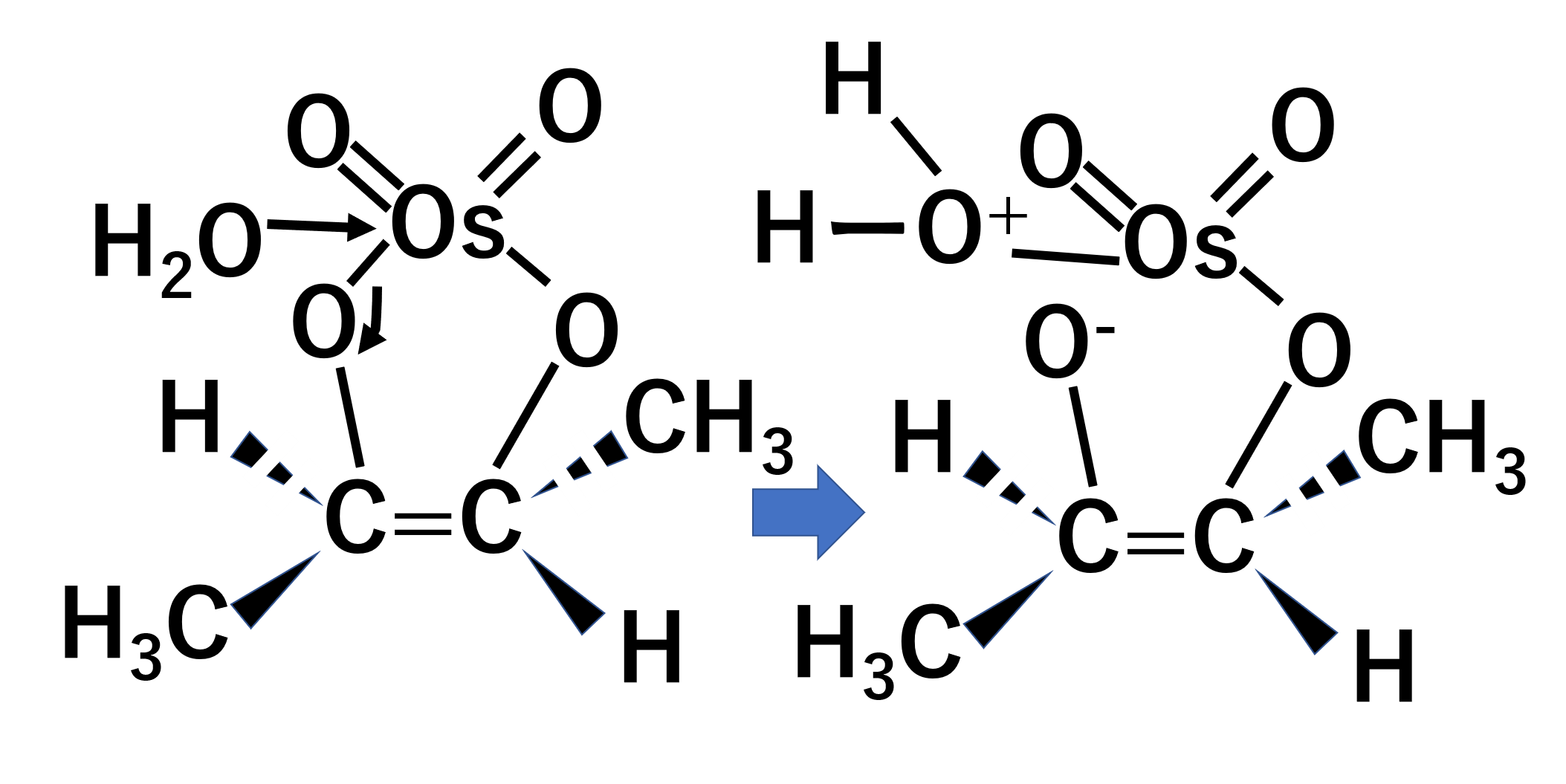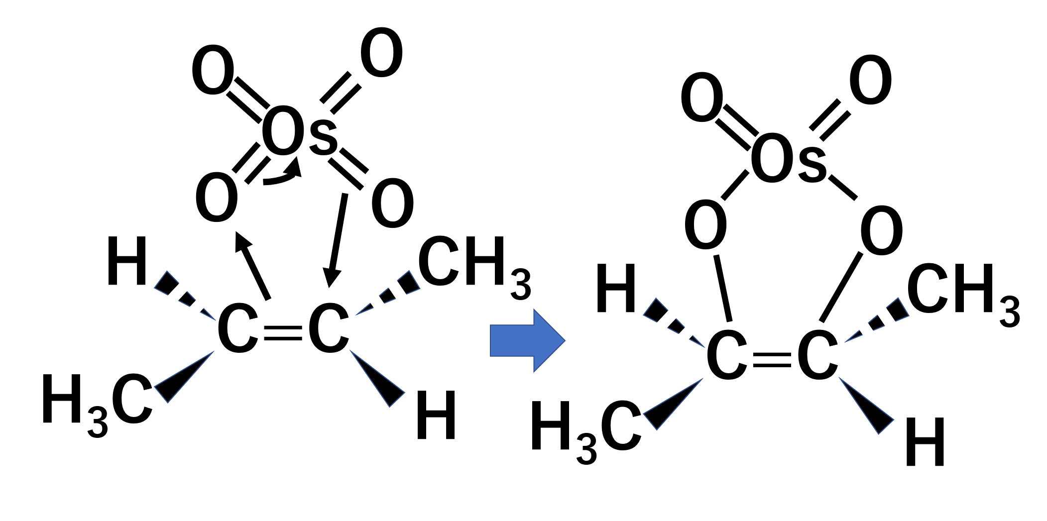 アルケンのπ結合が四酸化オスミウムを攻撃して環状化合物を作ります。