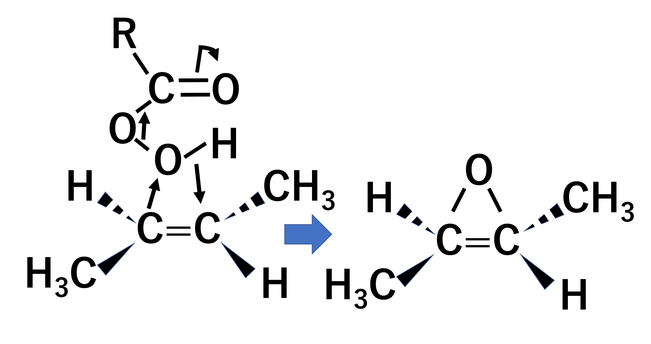 酸素がsyn付加してエポキシドを作ります。trans-ブタ-2-エンのエポキシ化の例を見てみましょう。