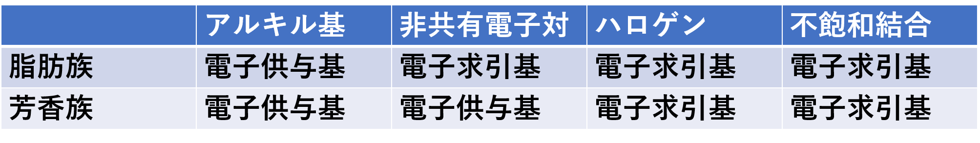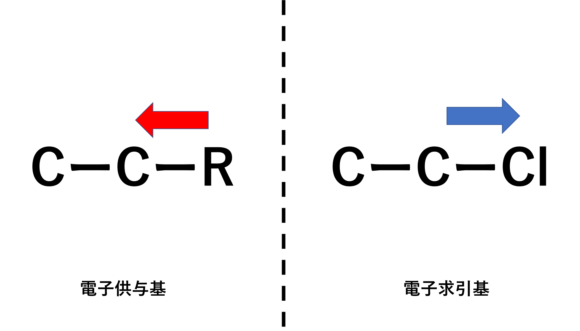 電気陰性度が大きいものは電子を引き付ける力が強いという話を以前しました。そのため炭素などに結合すると電子をひきつけようとします。このような置換基を電子求引基と呼びます。一方でアルキル基は電子を与えようとします。このようなものを電子供与基と呼びます。