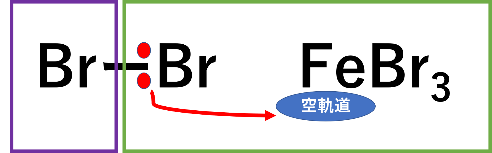この反応はFeの空軌道にBr2の片方の電子を受け取ることでBr+を作り求電子試薬として働くことで、求電子置換反応が起こります。