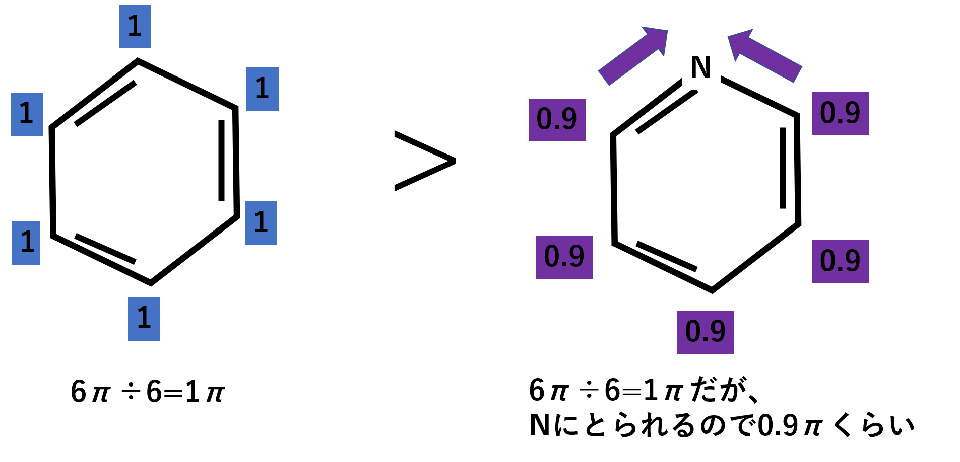 ピリジンはベンゼンの炭素1個が窒素に置き換わった構造をしています。ピリジンは電気陰性度が大きい窒素に置き換わっているため、ベンゼンに比べて電子をとられます。イメージとしてはベンゼンの全体のπ電子を6πとすると、6個の炭素で割るので炭素1個あたりは1πとなります。それに対してピリジンも同じようなイメージで考えると、6π÷6=1πですがNに電子をとられるので炭素1個あたり0.9πのような感じです。よって、反応性はベンゼンに比べるとピリジンは低くなります。