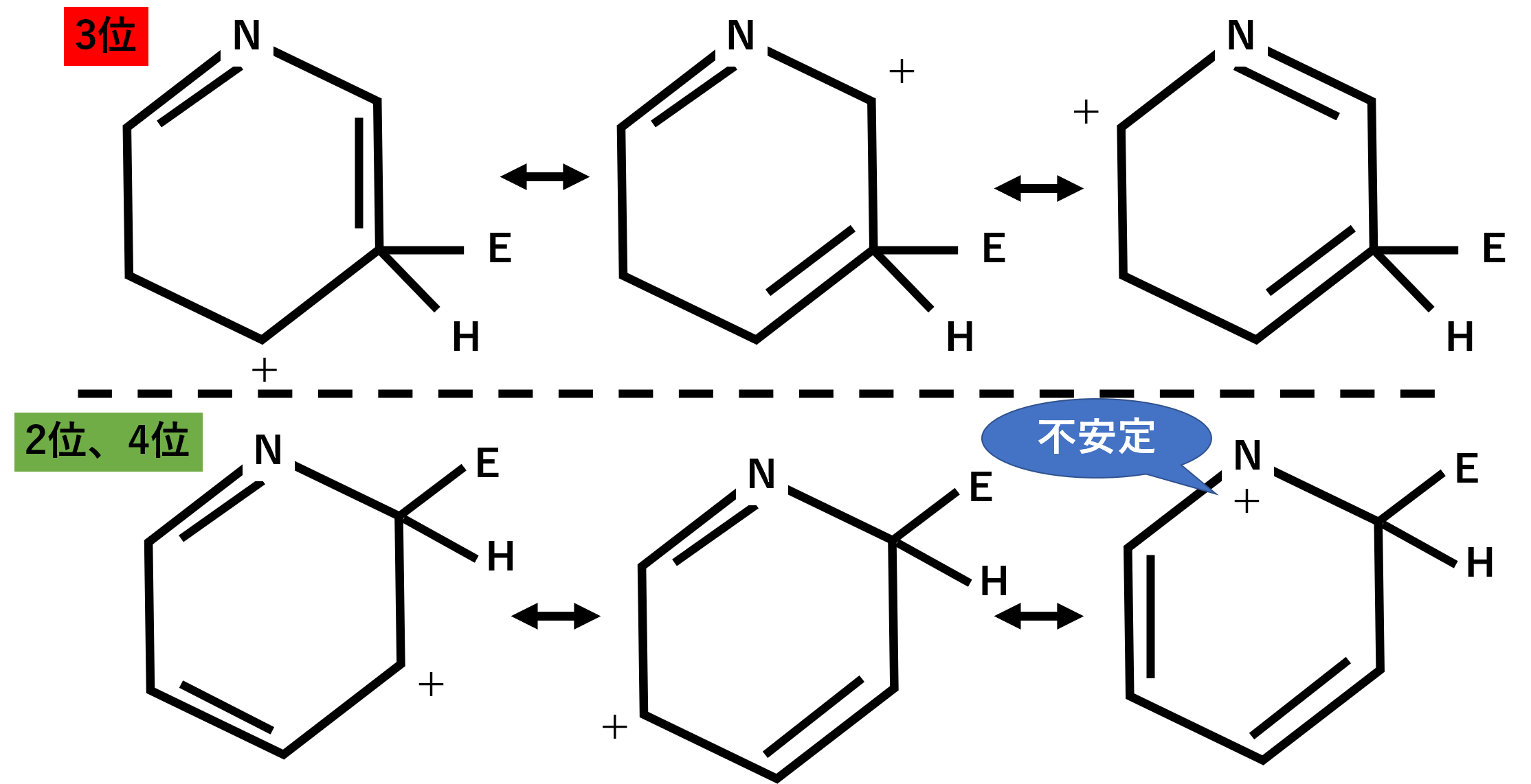 まず2位や4位についた場合の共鳴構造をみてみると、電気陰性度が大きい窒素がプラスとなっている構造があります。これは不安定です。