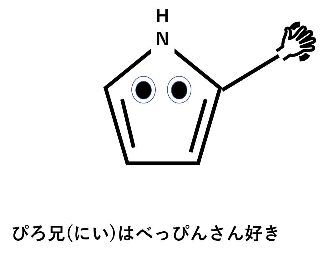イメージ作りの物語を。ベンゼン君の兄貴分のぴろ兄は、NHモヒカンを持つナイスガイです。そんなぴろ兄はべっぴんさんが大好きという話です。ぜひぴろ兄を何度も書いて覚えてください(笑)