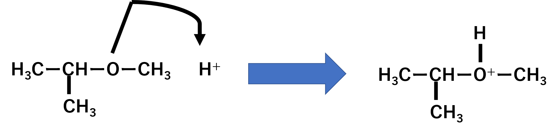まず先ほどの第一級エーテルや第二級エーテルと同様に、エーテルの酸素が強酸の水素を攻撃します。