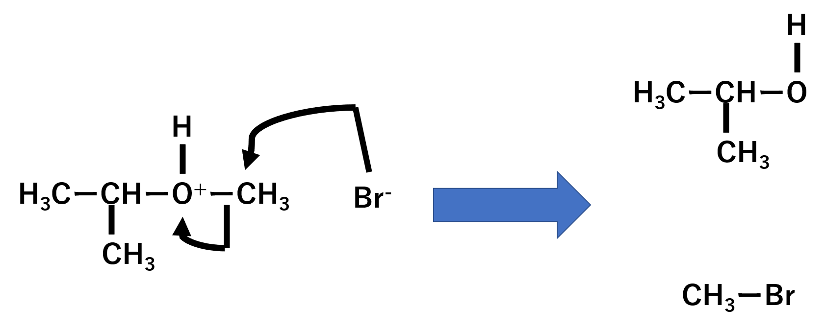 第一級エーテルや第二級エーテルは主にSN2反応で開裂が進みます。