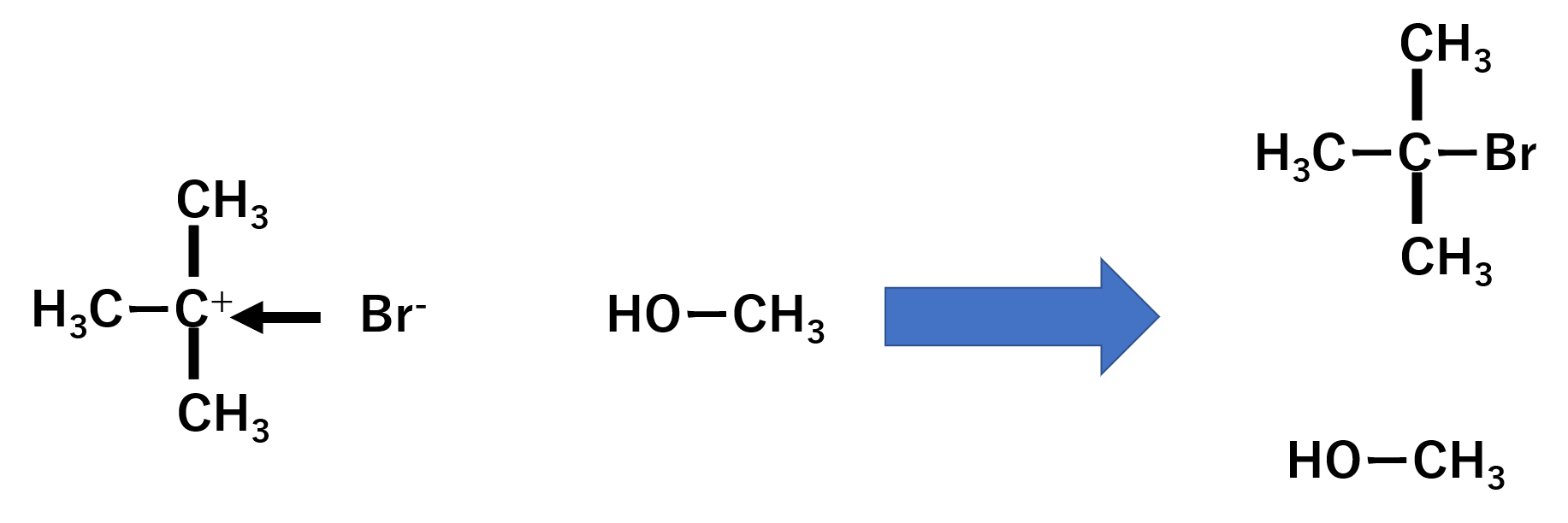最後は第三級カルボカチオンに目を付けたBr-が攻撃することで反応が完了します。