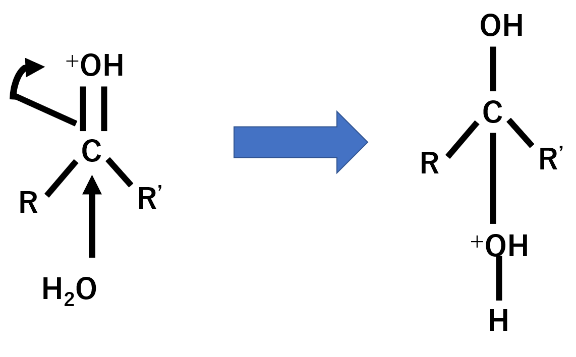 反応機構のイメージとしては、先ほどの水の付加と同じような形で行われます。