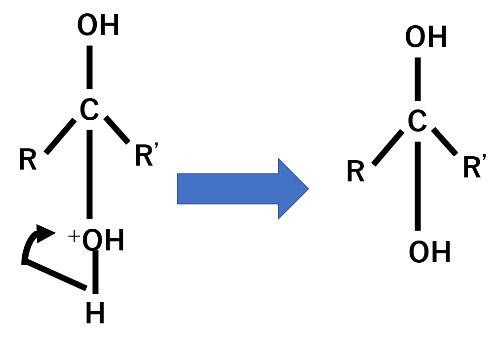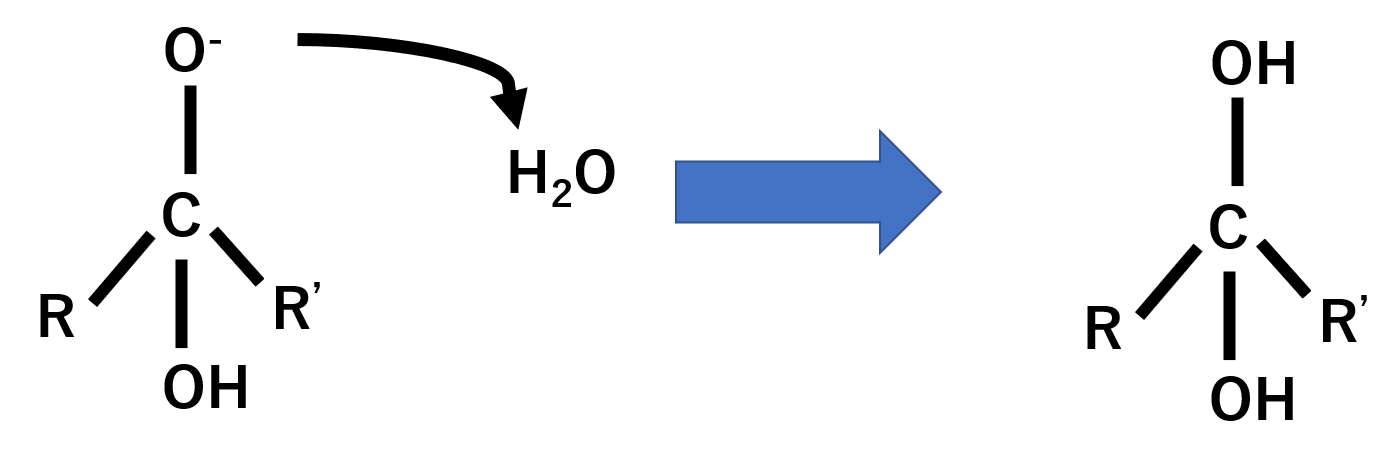 アルデヒドやケトンに酸や塩基を触媒として、水を反応させるとヒドレートができます。