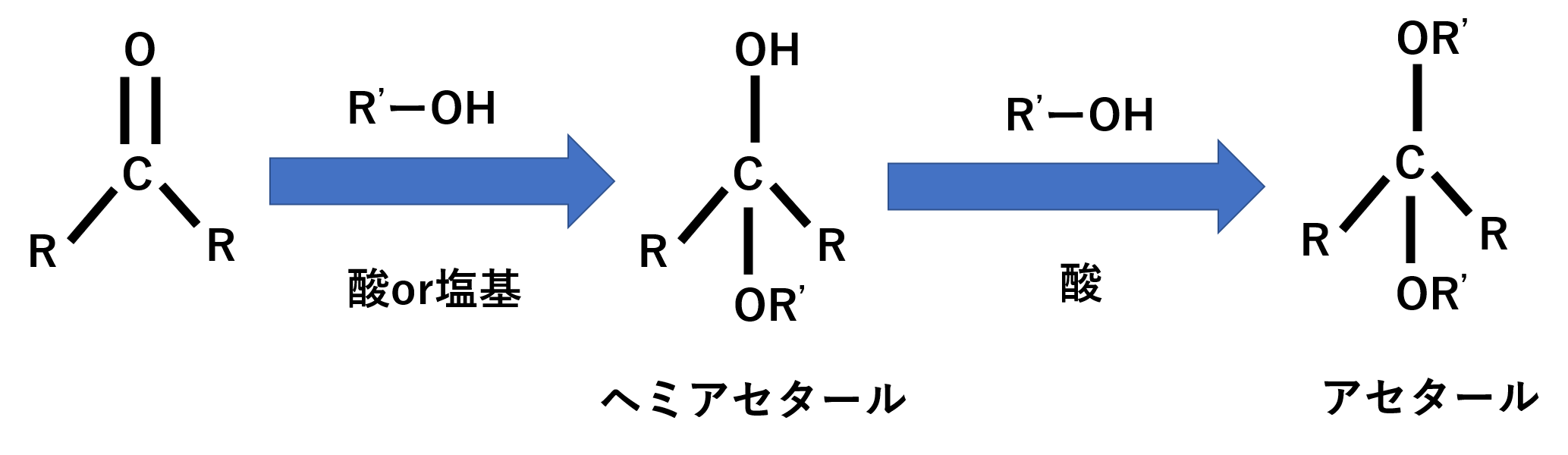 アルデヒドやケトンに酸や塩基を触媒として、アルコールを反応させるとヘミアセタールができます。この「ヘミ」とは半分と言う意味です。半分ということはまだその先があるということです。塩基性条件ではヘミアセタールで止まってしまいますが、酸性条件ではアセタールまで進みます。