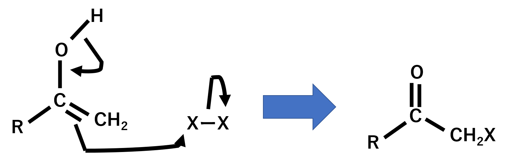 まず酸性条件なのでエノールができます。そして、エノールが求核試薬としてハロゲンを攻撃して完成します。