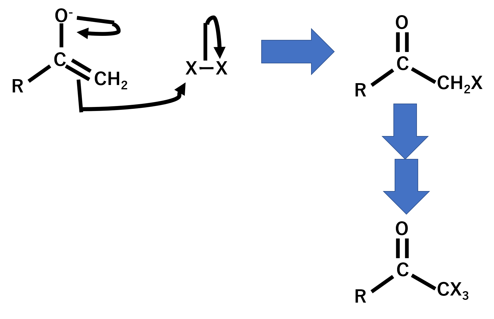 まず塩基性条件なのでエノラートイオンができます。そして、エノラートイオンが求核試薬としてハロゲンを攻撃してハロゲンが導入されます。電気陰性度が大きいハロゲンがつくことによって酸性度が高くなり更なる反応が起こります。その結果、同じ反応が繰り返されてハロゲンが3つ導入されます。