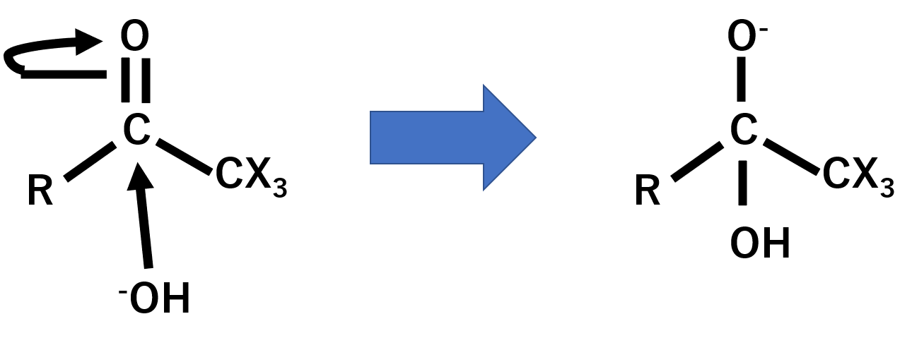 これでこの反応が終わりかと思いきや、まだ反応は続きます。今度は水酸化物イオンがカルボニル基を攻撃します。