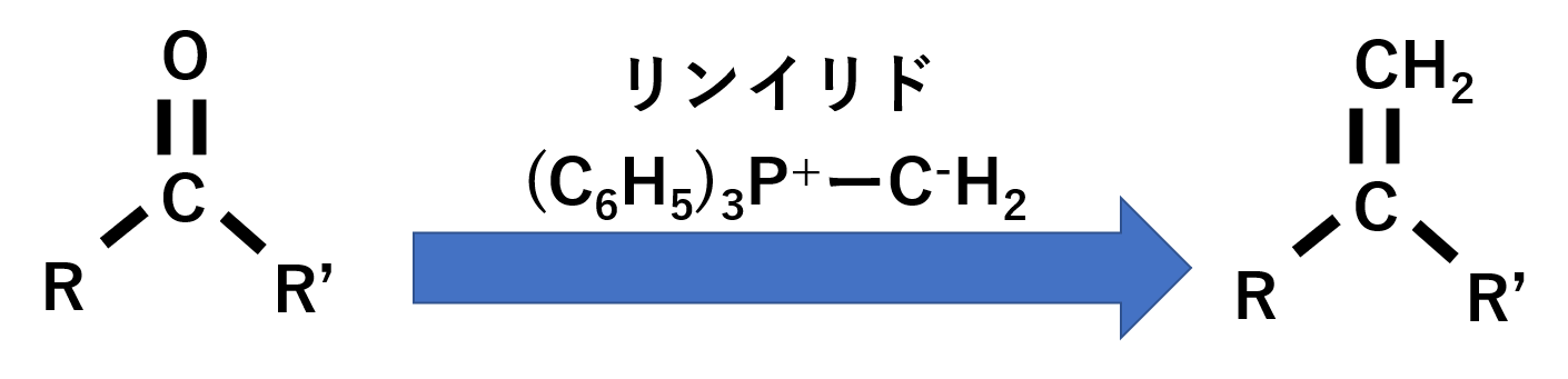 Wittig(ウィティッヒ)反応は、アルデヒドやケトンがリンイリドと反応してアルケンを作ります。