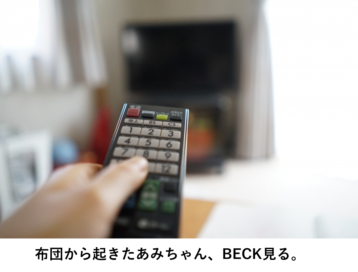 布団からバサッと目覚めたあみちゃん、今日は休みだ!!昨日借りてきたBECKでも見ようと映画を見ている物語です。ちなみにBECKはバンド系の映画です。