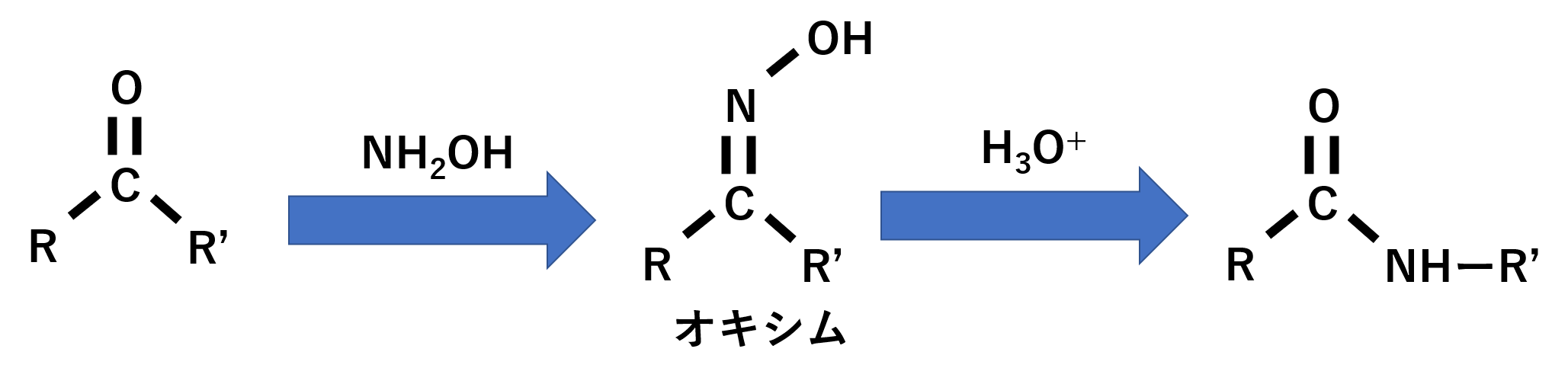 Beckmann(ベックマン)転移はケトンからオキシムができ、最終的にはアミドができます。