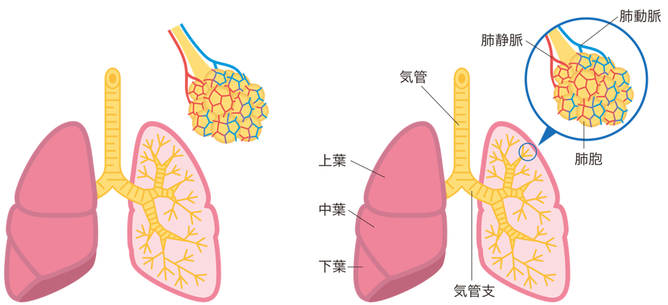次に肺ですが、肺も左右対称ではなく、右肺は上葉、中葉、下葉の3つからなり、左肺は上葉、下葉の2つからできています。肺には多くの肺胞があり、以下の肺胞上皮細胞からなります。
