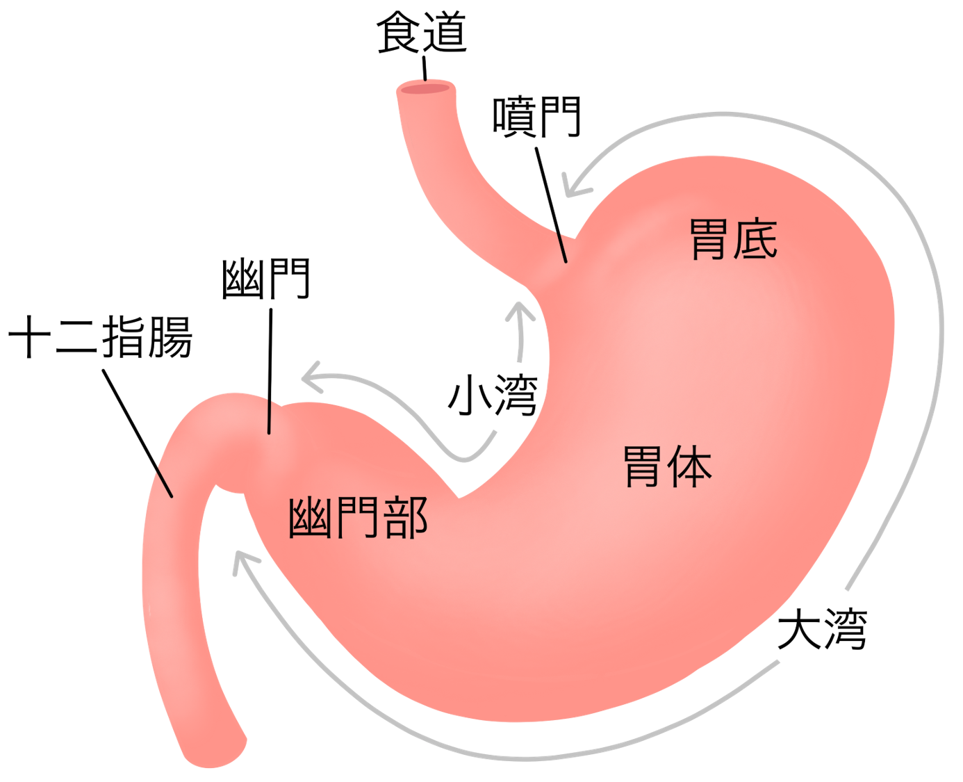 食べ物は口腔の後は、食道の蠕動運動により胃に運ばれます。以下の図のように、噴門、幽門、胃底、胃体、幽門、小弯、大弯などの部位があります。幽門には括約筋があり閉じることで、食べ物を一時的に胃にとどめておくことができます。