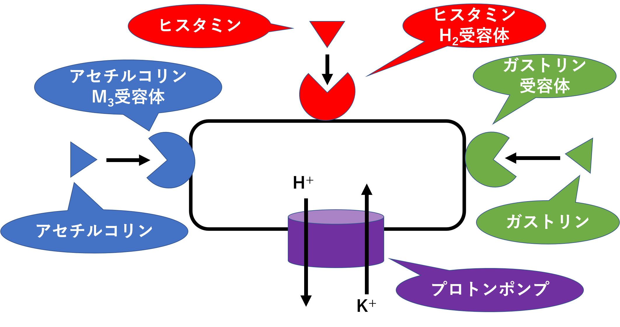 アセチルコリンM3受容体にアセチルコリン、ヒスタミンH2受容体にヒスタミン、ガストリン受容体にガストリンが結合して、それぞれの受容体が刺激されるとプロトンポンプ(H+,K+-ATPase)が活性化します。