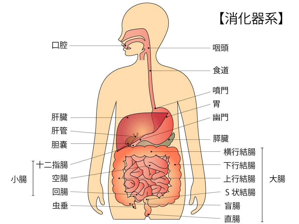 大腸は消化作用はほとんどなく、水分を吸収して糞便の形成、蠕動運動などを行い排泄に関わります。大腸は小腸側から盲腸、結腸、直腸となっていて、結腸はさらに上行結腸、横行結腸、S状結腸にわけられます。