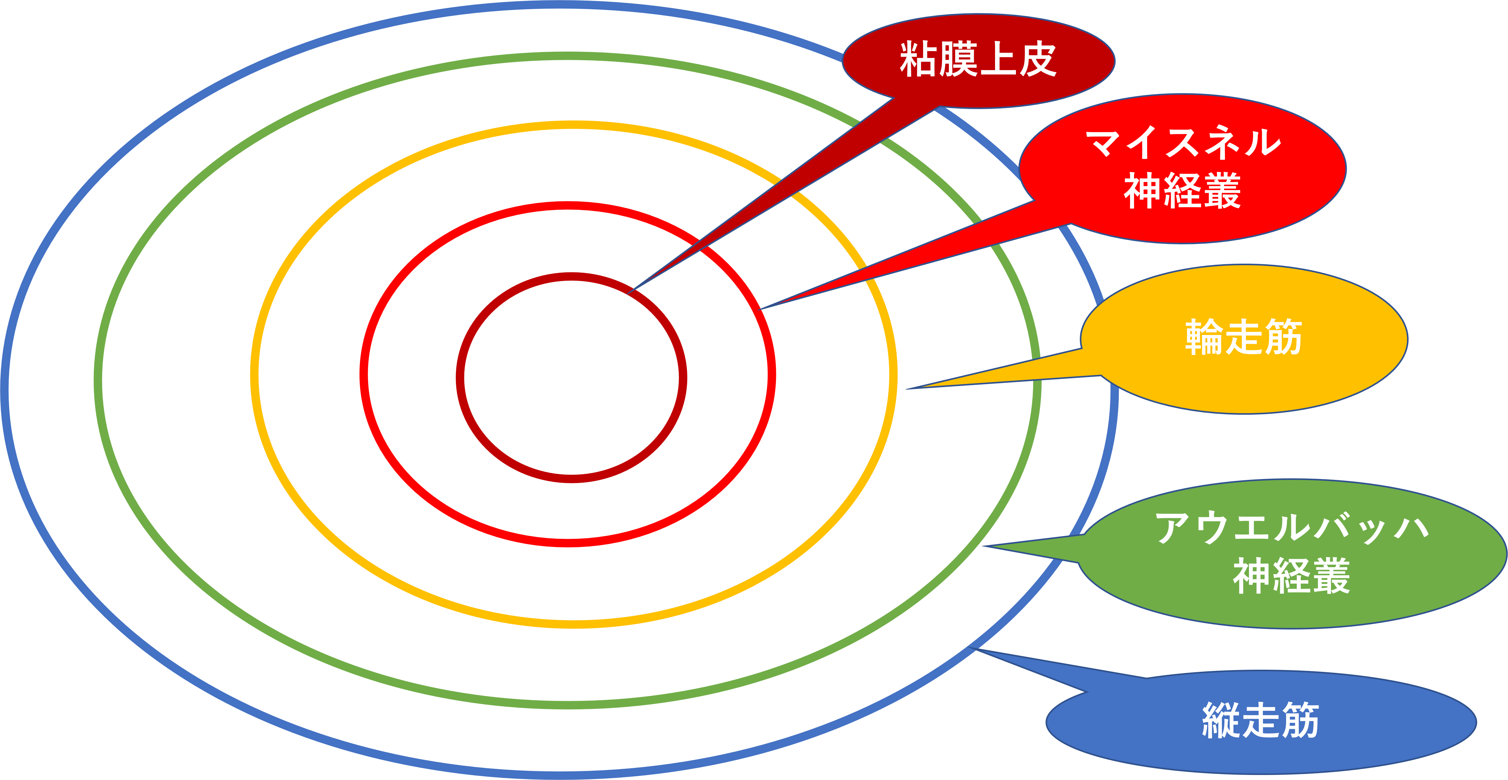 ここまでくると位置関係がややこしいですが、内側から粘膜、マイスネル神経叢、輪走筋、アウエルバッハ神経叢、縦走筋となります。