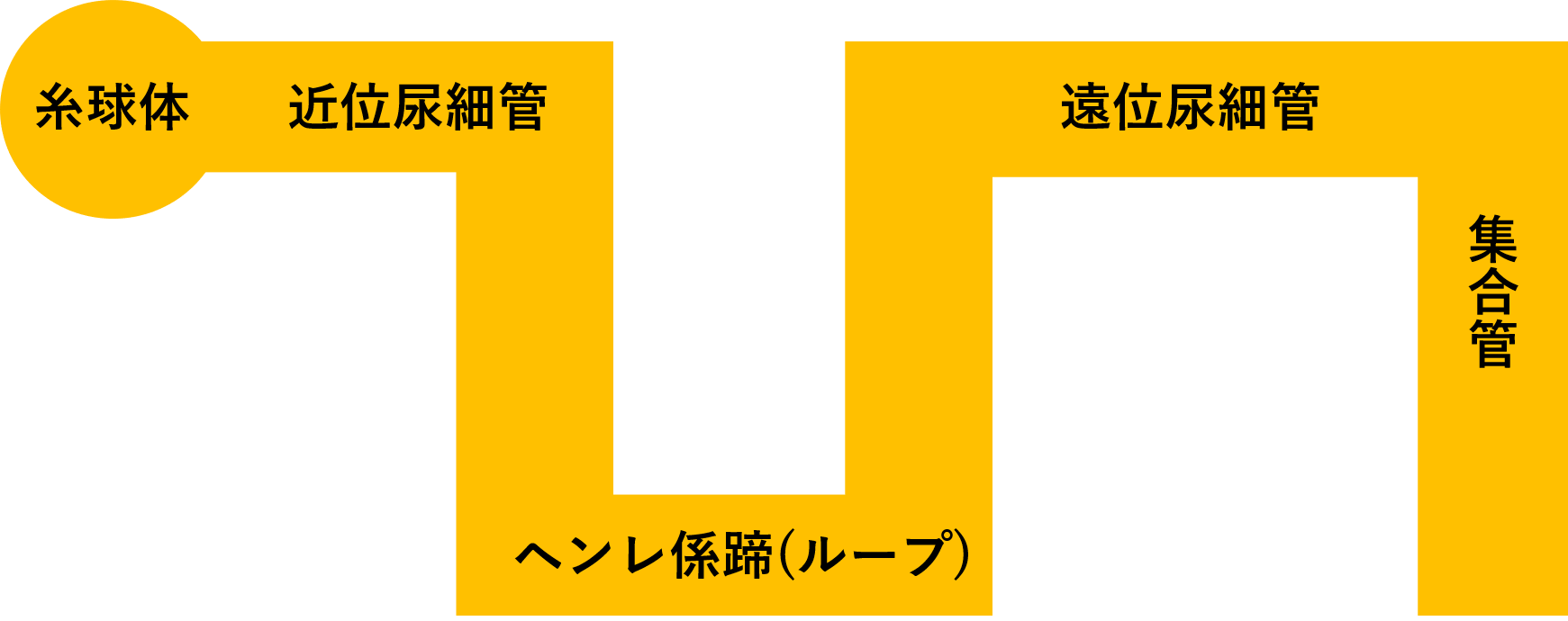 腎小体でろ過された原尿は尿細管へと行きます。尿細管では近位尿細管、ヘンレ係蹄、遠位尿細管、集合管と流れていき尿として排泄されます。