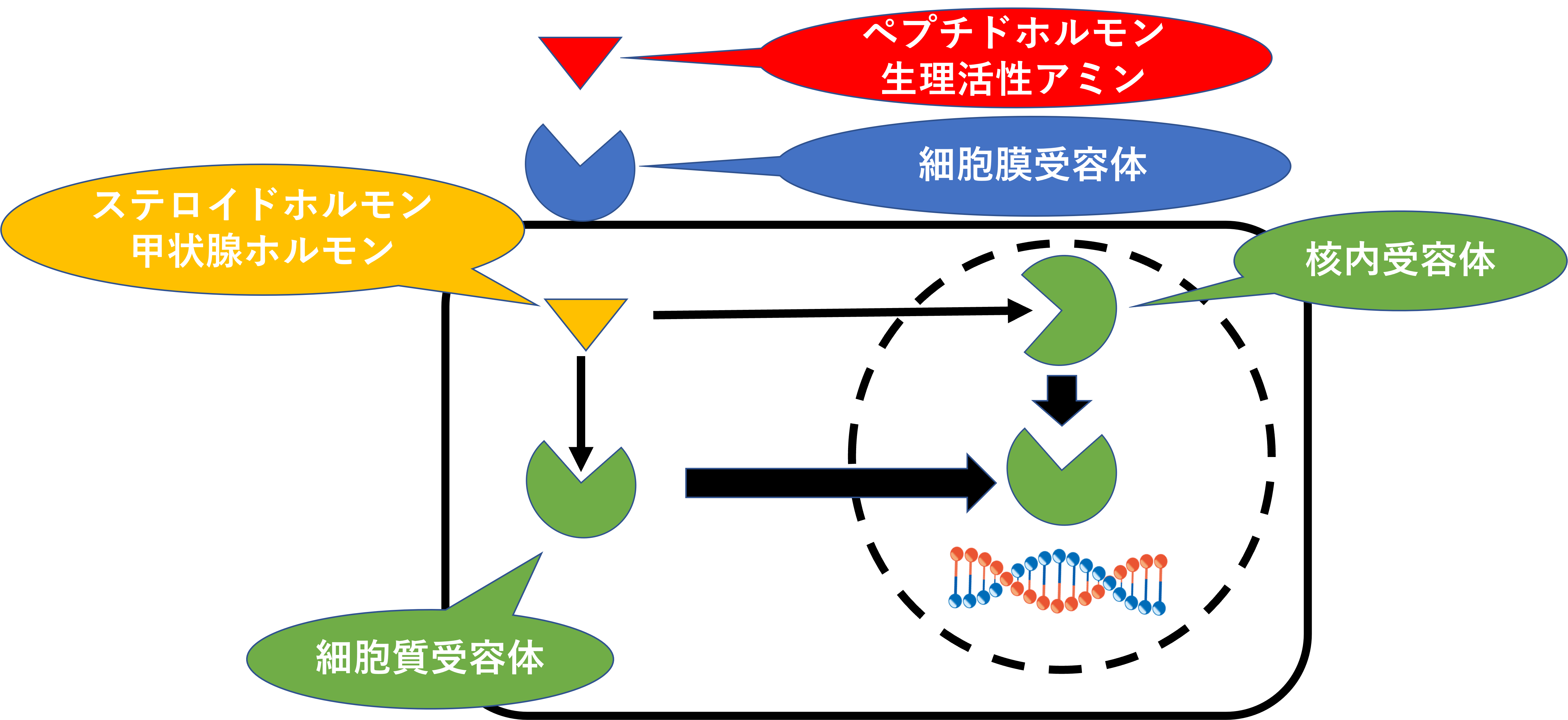 ホルモンのうち、ペプチドホルモンや生理活性アミンなどのほとんどのホルモンは標的細胞の細胞膜受容体に結合してGタンパク質やチロシンキナーゼを介して作用します。