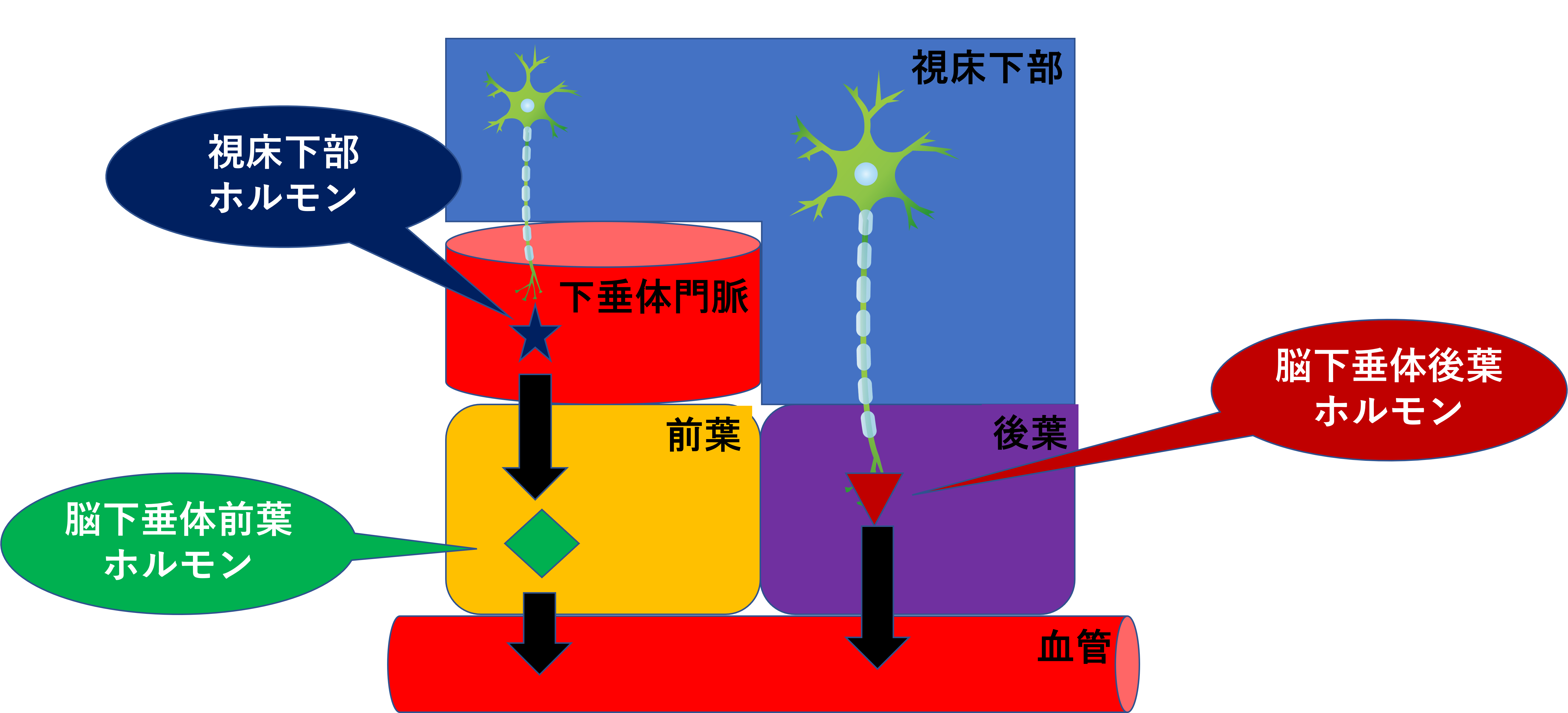 脳下垂体前葉からは、基本は刺激ホルモン放出ホルモンが出てきますが、プロラクチンと成長ホルモンは例外です。脳下垂体後葉からはオキシトシンとバソプレシンが出てきます。