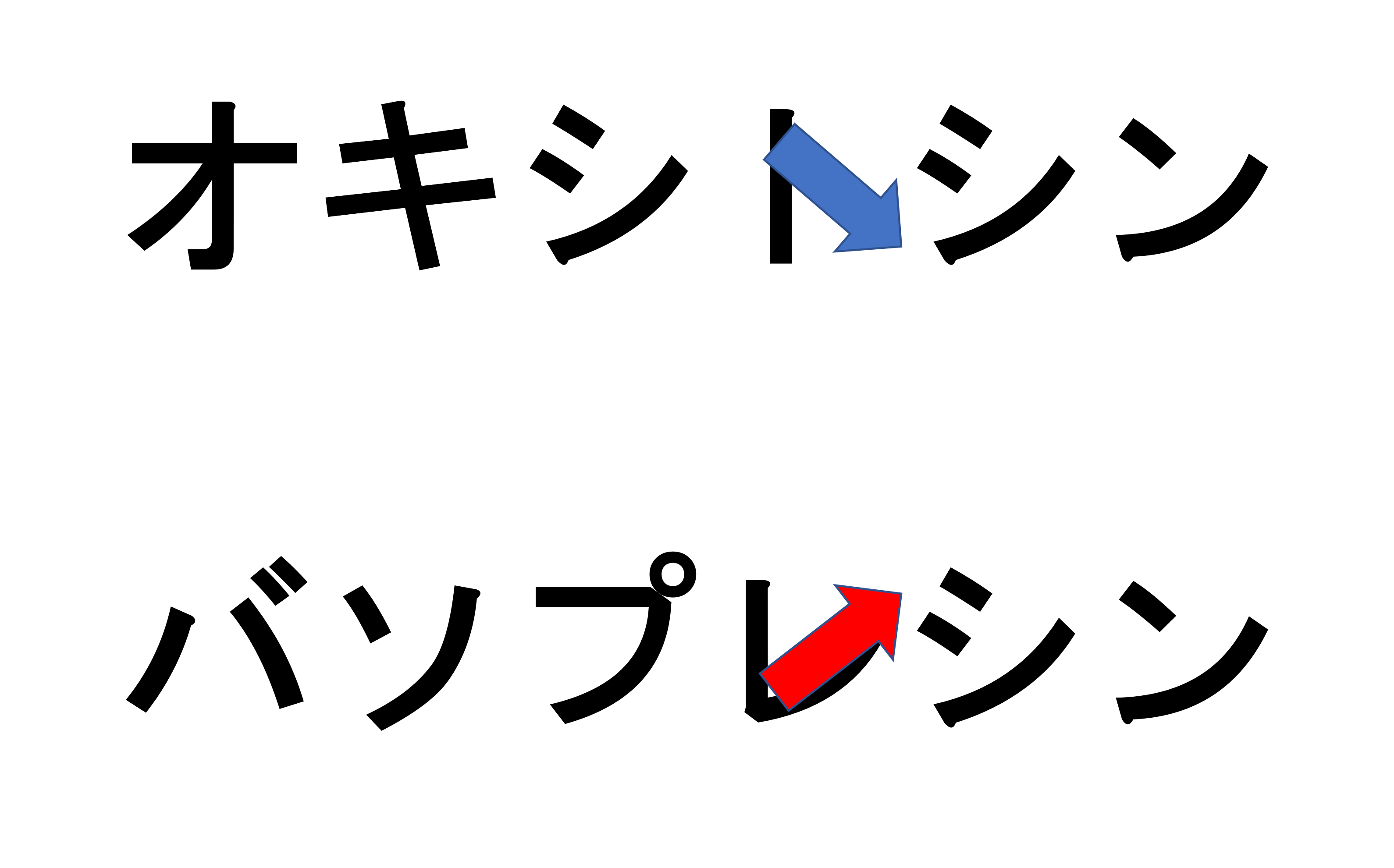 国家試験的にはオキシトシンとバソプレシンが「〜シン」と似ていることから血圧の上げ下げで引っ掛けてきます。そこで覚え方のヒントですが、それぞれの4文字目に注目すると、オキシトシンの「ト」は下に下がるので血圧下降、バソプレシンの「レ」は上に上がるので血圧上昇と覚えられます。