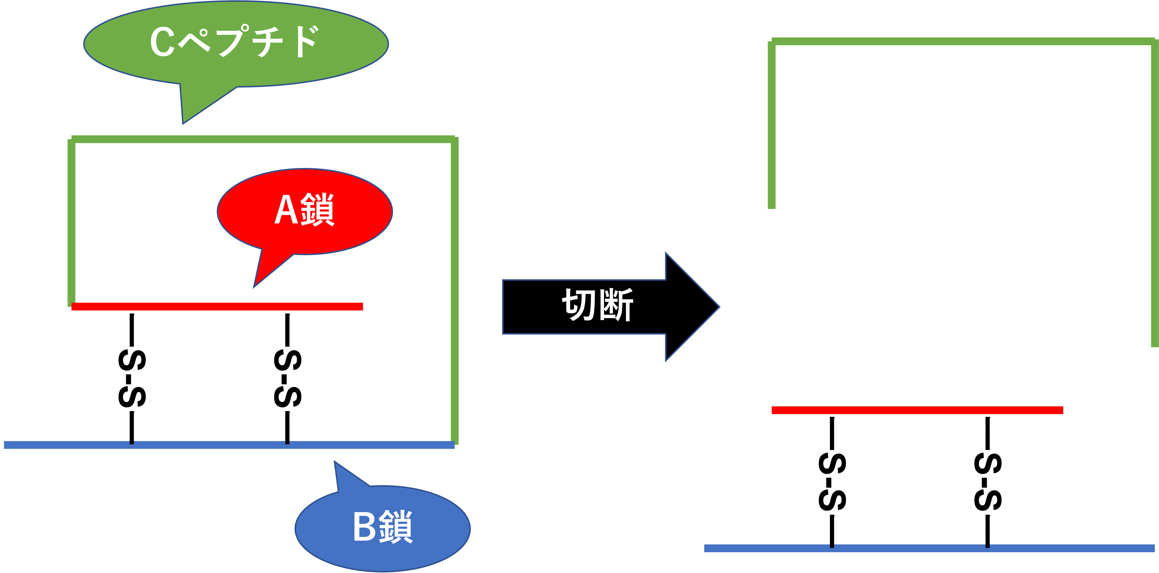 インスリンはβ細胞から分泌されるポリペプチドです。β細胞で、プレプロインスリンが作られ、次にプロインスリンとなります。プロインスリンはA鎖とB鎖とCペプチドがつながった構造をしています。