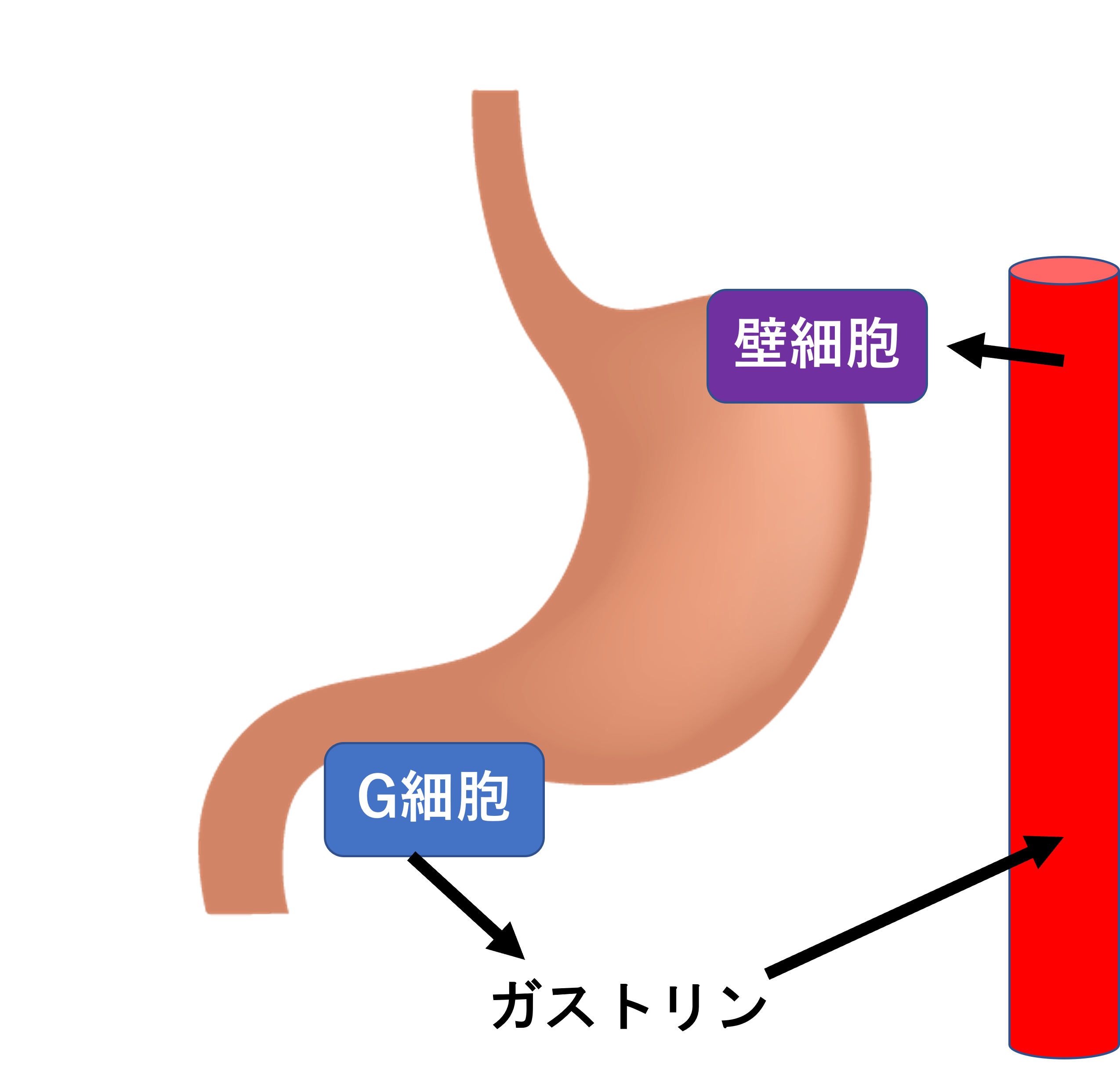 ガストリンは胃幽門部のG細胞から分泌され、胃壁細胞に作用することで胃酸分泌促進作用があります。イメージとしては以下のような図になります。
