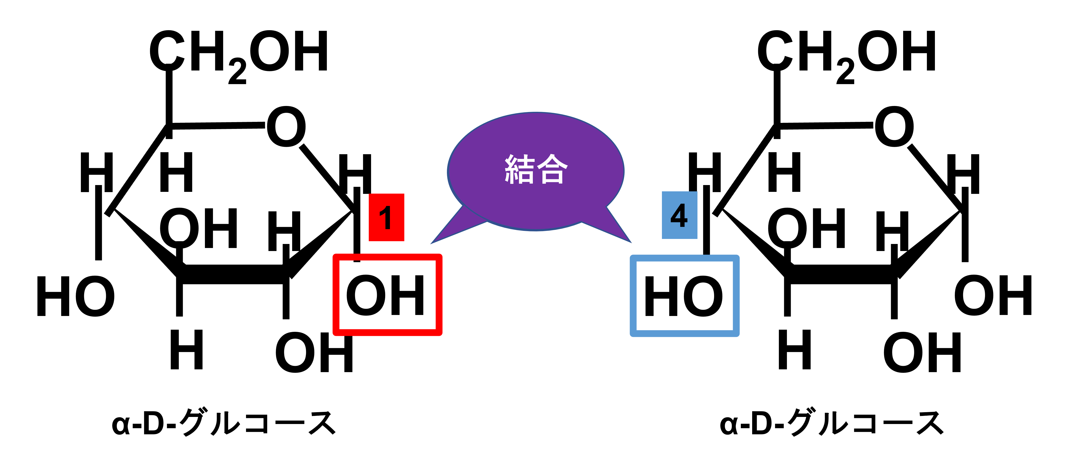 ちなみにα(1→4)というのは、α体のグルコースの1位と4位が結合しているということを表しています。そのためアミロースはまっすぐの直鎖構造になります。唾液や膵液に含まれるα-アミラーゼはアミロースのα(1→4)結合を分解します。