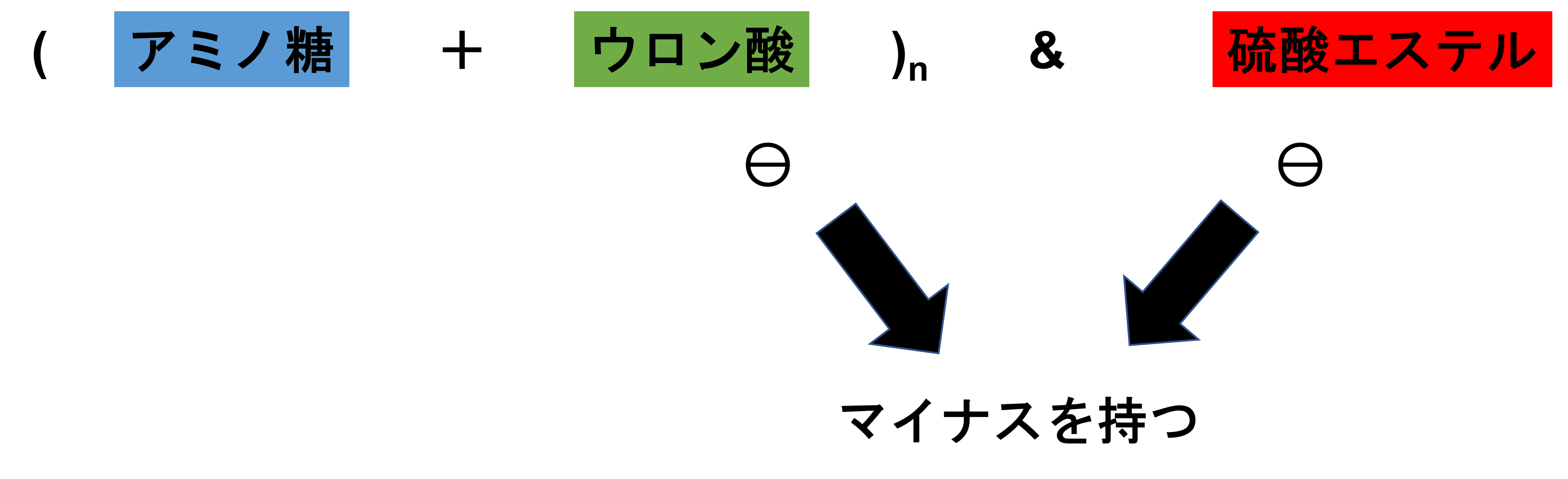 複合多糖は2種類以上の糖で作られていて、別名ヘテロ多糖とも呼ばれます。複合多糖であるグリコサミノグリカンはアミノ糖とウロン酸の繰り返し構造を持ち、硫酸エステルものもあります。ウロン「酸」と硫「酸」エステルとあるように、グリコサミノグリカンの分子としては負に荷電しています。