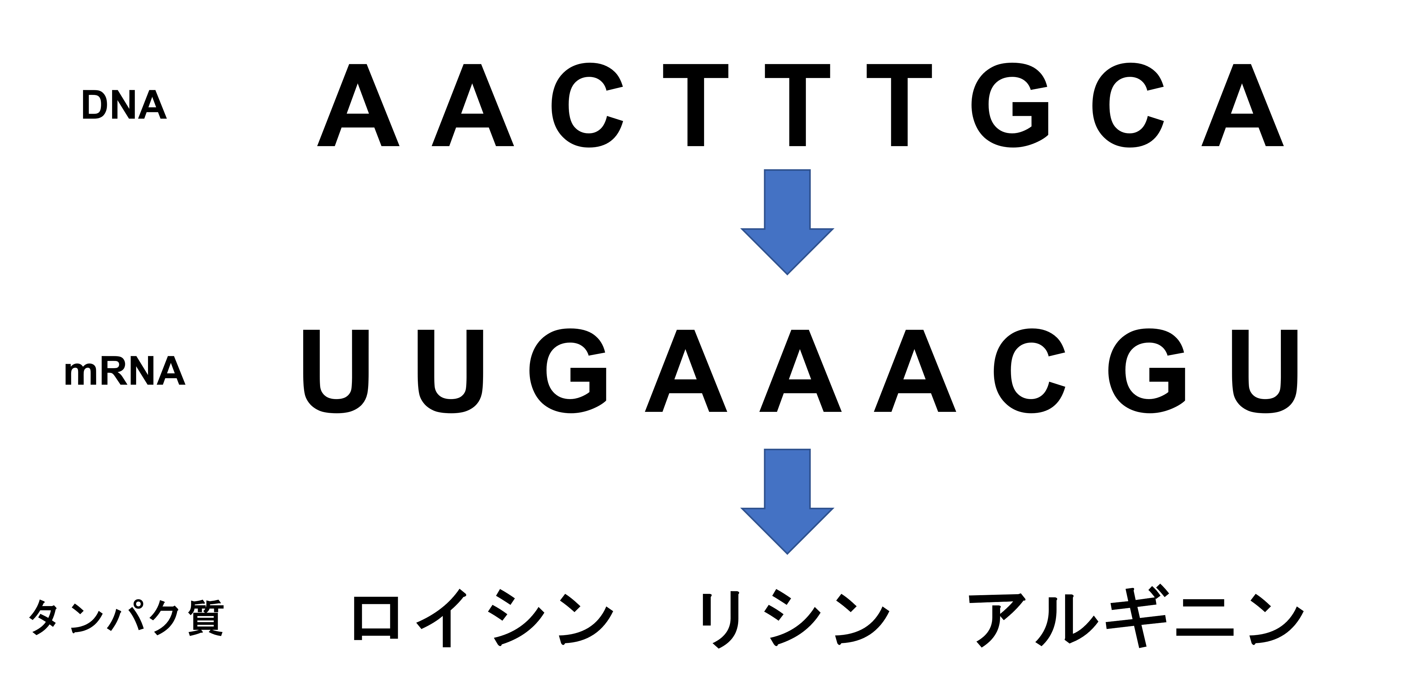 転写、翻訳からタンパク質を作る時に、mRNAの塩基3つの並びに対して特定のアミノ酸が作られこれをコドンと呼びます。例えばAAAというコドンに対してはリシンが作られます。
