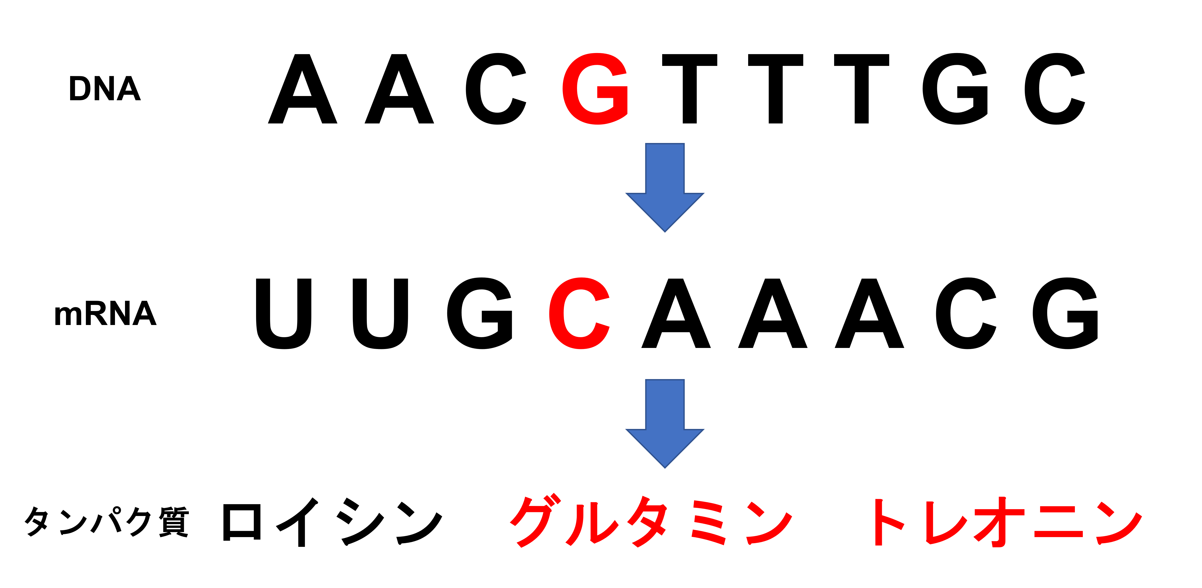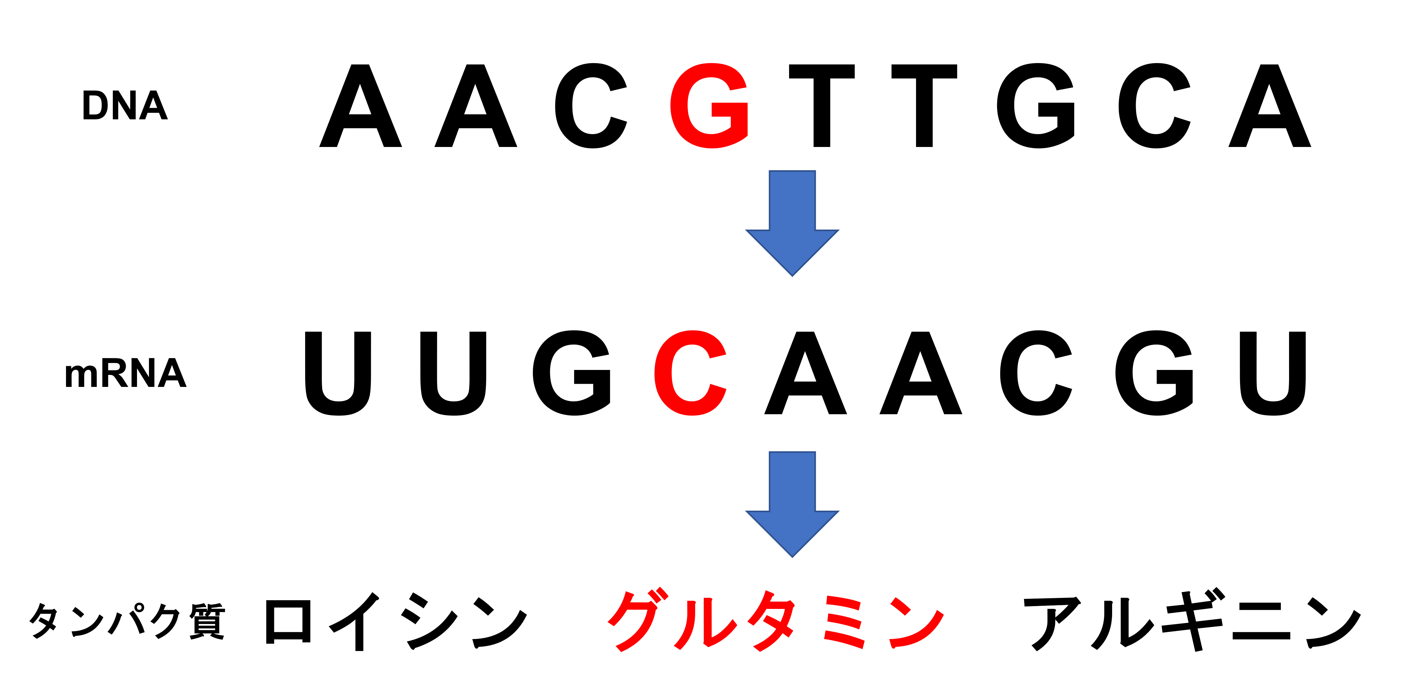 ミスセンス変異はDNAの塩基が本来とは異なるものに置き換わってしまい、それが転写、翻訳されて本来できるタンパク質とは違うタンパク質ができてしまう変異を言います。例えば先ほどのAAAが変異によりCAAに変わってしまったら、グルタミンが作られてしまいます。
